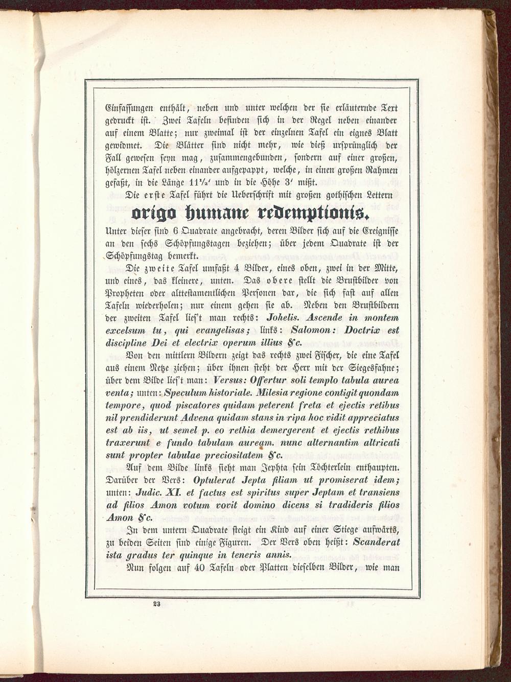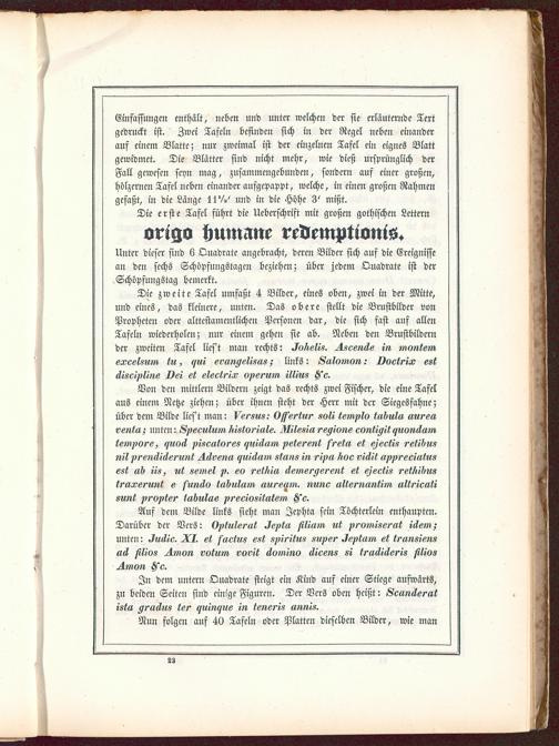 Einfassungen enthält, neben und unter welchen der sie erläuternde Tertgedruckt ist. Zwei Tafeln befinden sich in der Regel neben einanderauf einem Blatte; nur zweimal ist der einzelnen Tafel ein eignes Blattgewidmet. Die Blätter sind nicht mehr, wie dieß ursprünglich derFall gewesen seyn mag, zusammengebunden, sondern auf einer großen,hölzernen Tafel neben einander aufgepappt, welche, in einen großen Rahmengefaßt, in die Länge 11V-^ und in die Höhe 3^ mißt.