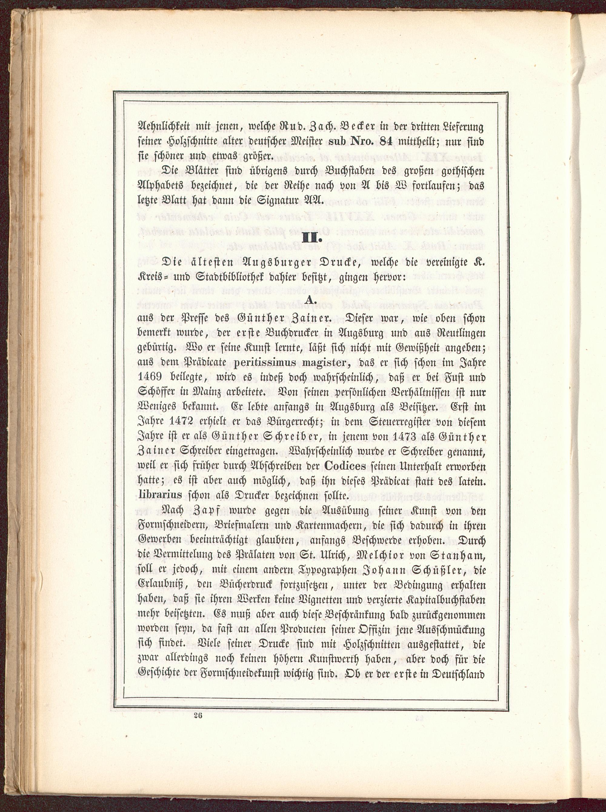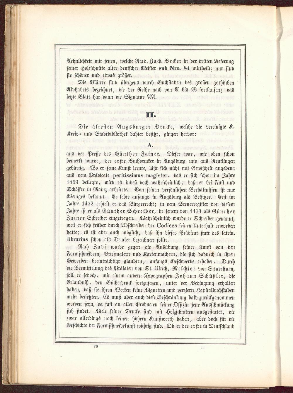 aus der Presse des Günther Zainer . Dieser war, wie oben schonbemerkt wurde, der erste Buchdrucker in Augsburg und aus Reutlingen gebürtig. Wo er seine Kunst lernte, läßt sich nicht mit Gewißheit angeben;aus dem Prädicate xsiitii-simu« niÄKistei-, das er sich schon im Jahre1469 beilegte, wird es indeß doch wahrscheinlich, daß er bei Fust undSchöffer in Mainz arbeitete. Von seinen Persönlichen Verhältnissen ist nurWeniges bekannt. Er lebte anfangs in Augsburg als Beisitzer. Erst imJahre 1472 erhielt er das Bürgerrecht; in dem Steuerregister von diesemJahre ist er als Günther Schreiber, in jenem von 1473 als GüntherZainer Schreiber eingetragen. Wahrscheinlich wurde er Schreiber genannt,weil er sich früher durch Abschreiben der Ooäiess seinen Unterhalt erworbenhatte; es ist aber auch möglich, daß ihn dieses Prädieat statt des latein.libi'iU'ius schon als Drucker bezeichnen sollte.