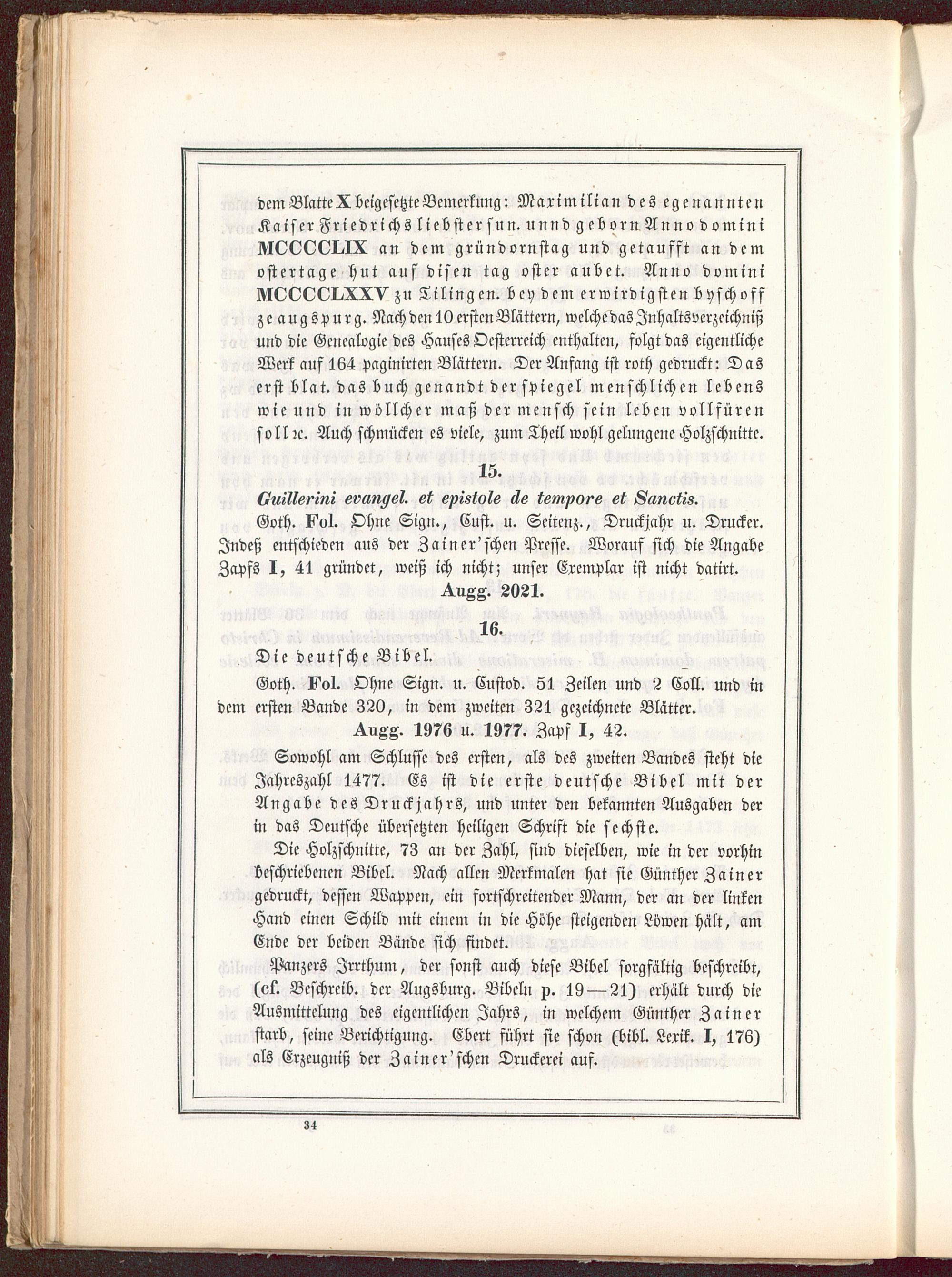 Panzers Irrthum, der sonst auch diese Bibel sorgfältig beschreibt,(vt. Beschreib, der Augsburg . Bibeln x. 19 — 21) erhält durch dieAusmittelung des eigentlichen Jahrs, in welchem Günther Zainer starb, seine Berichtigung. Ebert führt sie schon (bibl. Lerik. I, 176)als Erzeugniß der Zainer 'schcn Druckerei auf.