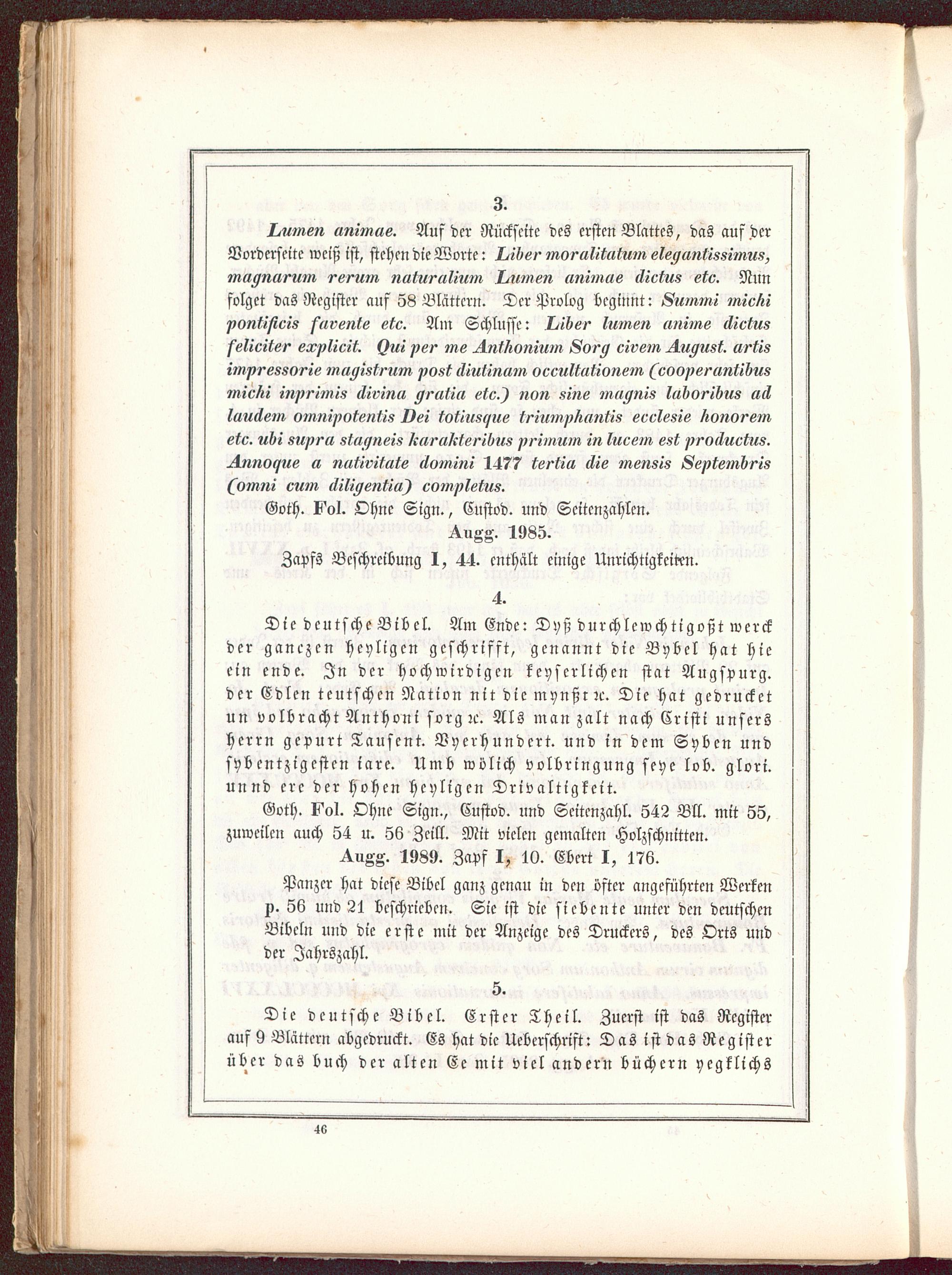 Goth. ^ol. Ohne Sign., Custod. und Seitenzahl. 542 Bll. mit 55,zuweilen auch 54 u. 56 Zeill. Mit vielen gemalten Holzschnitten.^UKK. 1989. Zapf I, 10. Ebert I, 176.Panzer hat diese Bibel ganz genau in den öfter angeführten Werken