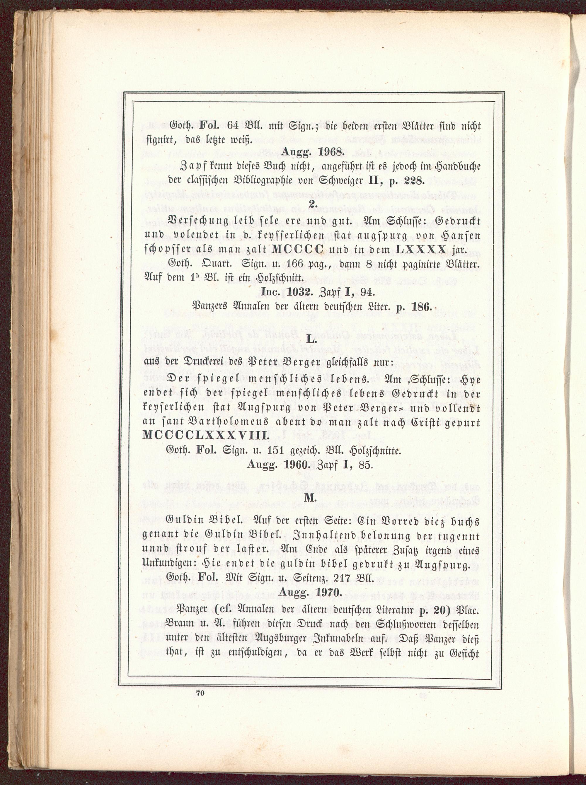 Panzer (et. Annalen der ältern deutschen Literatur p. 30) Plac.Braun u. A. fuhren diesen Druck nach den Schlußworten desselbenunter den ältesten Augsburger Inkunabeln auf. Daß Panzer dießthat, ist zu entschuldigen, da er das Werk selbst nicht zu Gesicht