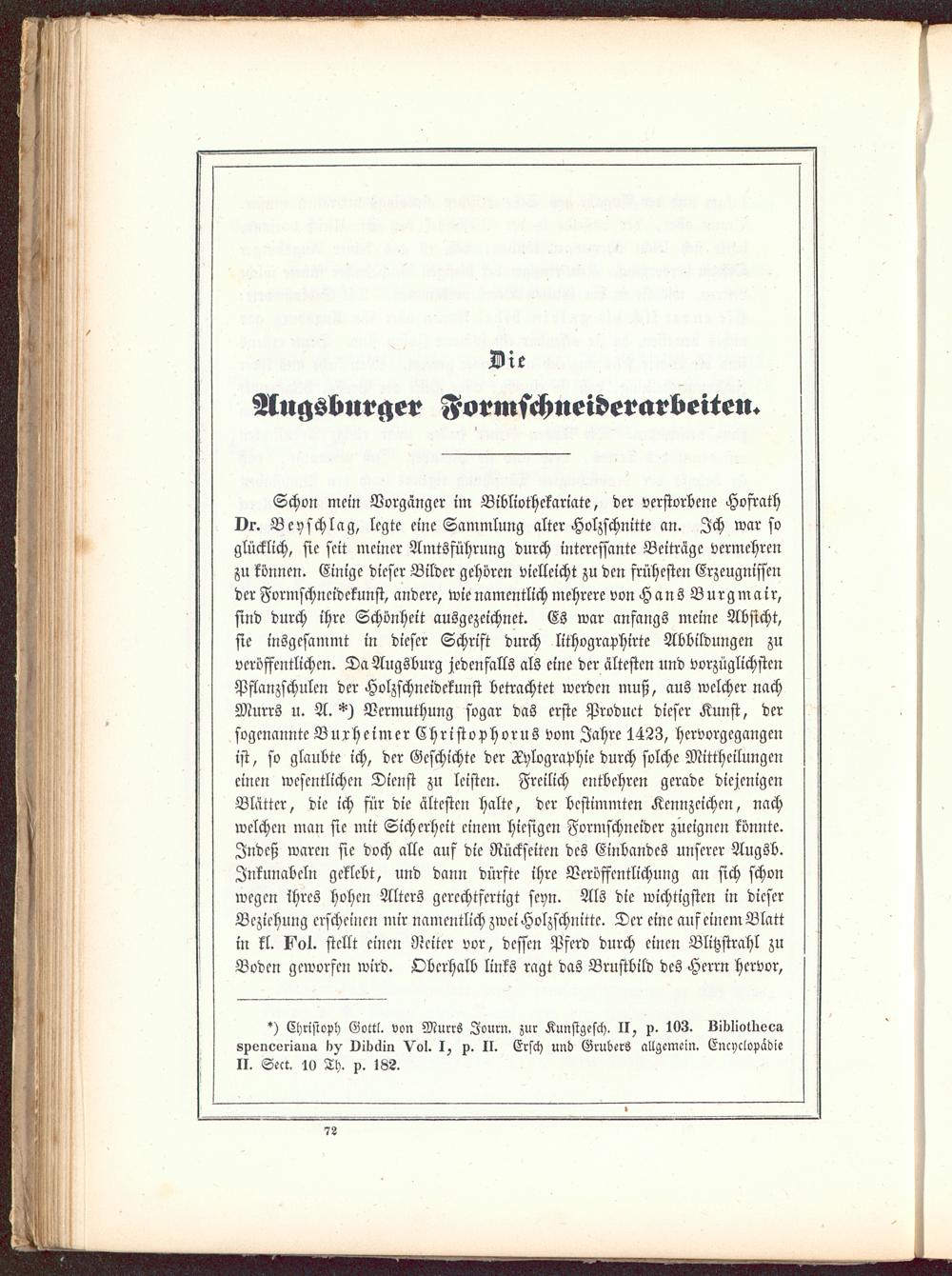 Schon mein Vorgänger im Bibliothekariate, der verstorbene HofrathDr. Beyschlag, legte eine Sammlung alter Holzschnitte an. Ich war soglücklich, sie seit meiner Amtsführung durch interessante Beiträge vermehrenzu können. Einige dieser Bilder gehören vielleicht zu den frühesten Erzeugnissender Formschneidekunst, andere, wie namentlich mehrere von Hans Burgmair,sind durch ihre Schönheit ausgezeichnet. Es war anfangs meine Absicht,sie insgesammt in dieser Schrift durch lithographirte Abbildungen zuveröffentlichen. Da Augsburg jedenfalls als eine der ältesten und vorzüglichstenPflanzschulen der Holzschneidekunst betrachtet werden muß, aus welcher nachMurrs u. A. Vermuthung sogar das erste Product dieser Kunst, dersogenannte Burheimer Christophorus vom Jahre 1423, hervorgegangenist, so glaubte ich, der Geschichte der Xylographie durch solche Mittheilungeneinen wesentlichen Dienst zu leisten. Freilich entbehren gerade diejenigenBlätter, die ich für die ältesten halte, der bestimmten Kennzeichen, nachwelchen man sie mit Sicherheit einem hiesigen Formschneider zueignen könnte.Indeß waren sie doch alle auf die Rückseiten des Einbandes unserer Augsb.Inkunabeln geklebt, und dann dürfte ihre Veröffentlichung an sich schonwegen ihres hohen Alters gerechtfertigt seyn. Als die wichtigsten in dieserBeziehung erscheinen mir namentlich zwei Holzschnitte. Der eine aufcinem Blattin kl. k'ol. stellt einen Nciter vor, dessen Pferd durch einen Blitzstrahl zuBoden geworfen wird. Oberhalb links ragt das Brustbild des Herrn hervor,