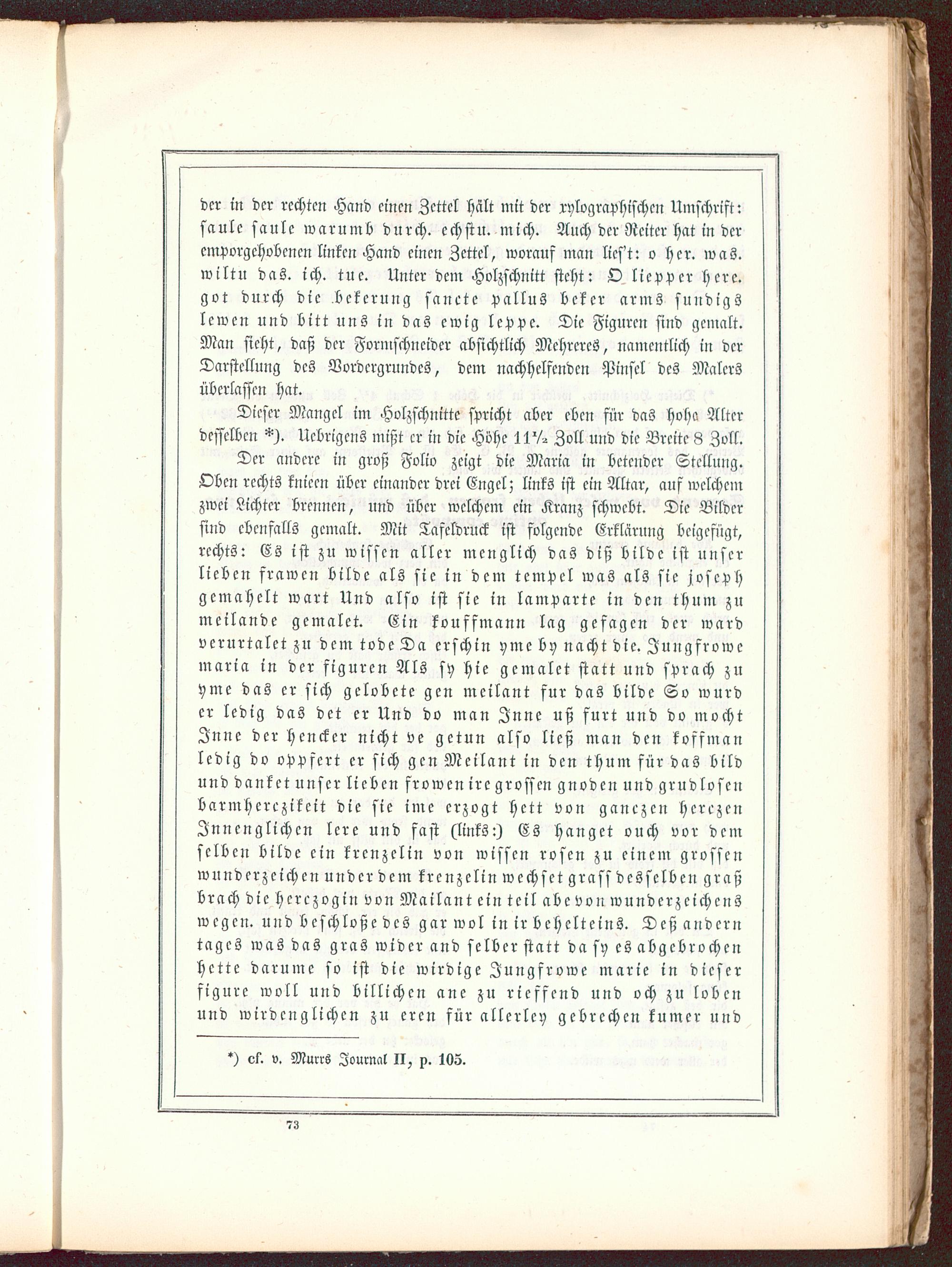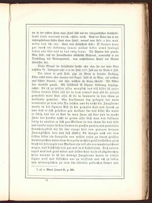 Der andere in groß Folio zeigt die Maria in betender Stellung.Oben rechts knieen über einander drei Engel; links ist ein Altar, auf welchemzwei Lichter brennen, und über welchem ein Kranz schwebt. Die Bildersind ebenfalls gemalt. Mit Tafeldruck ist folgende Erklärung beigefügt,rechts: Es ist zu wissen aller mcnglich das diß bilde ist unserlieben frawen bilde als sie in dem tempel was als sie josephgemahclt wart Und also ist sie in lamparte in den thum zumeilande gemalet. Ein kouffmann lag gefcigen der wardverurteilet zu dem tode Da erschin yme bv nacht die. Jungfrowemaria in der figuren Als sy hie gemalet statt und sprach zuyme das er sich gelobete gen meilant für das bilde So würder ledig das det er Und do man Jnne uß furt und do möchtJnne der hencker nicht ve getun also ließ man den koffmanledig do oppfert er sich gen Meilant in den thum für das bildund danket unser lieben frowen irc grossen gnoden und grudlosenbarmherezikeit die sie ime erzogt hett von ganczen herczenJnnenglichen lere und fast (links:) Es hanget ouch vor demselben bilde ein krenzelin von wissen rosen zu einem grossenwnnderze ichen under dem krenzelin wechset grass desselben graßbrach die herczogin von Mailant ein teil abe von wunderzeich enswegen, und beschloße des gar wol in ir behelteins. Deß anderntages was das gras wider and selber statt da sy es abgebrochenhctte darume so ist die wirdige Jungfrowe marie in dieserfigure woll und billichen ane zu ricffend und och zu lobenund wirdenglichen zu eren für allerley gebrechen kumer und