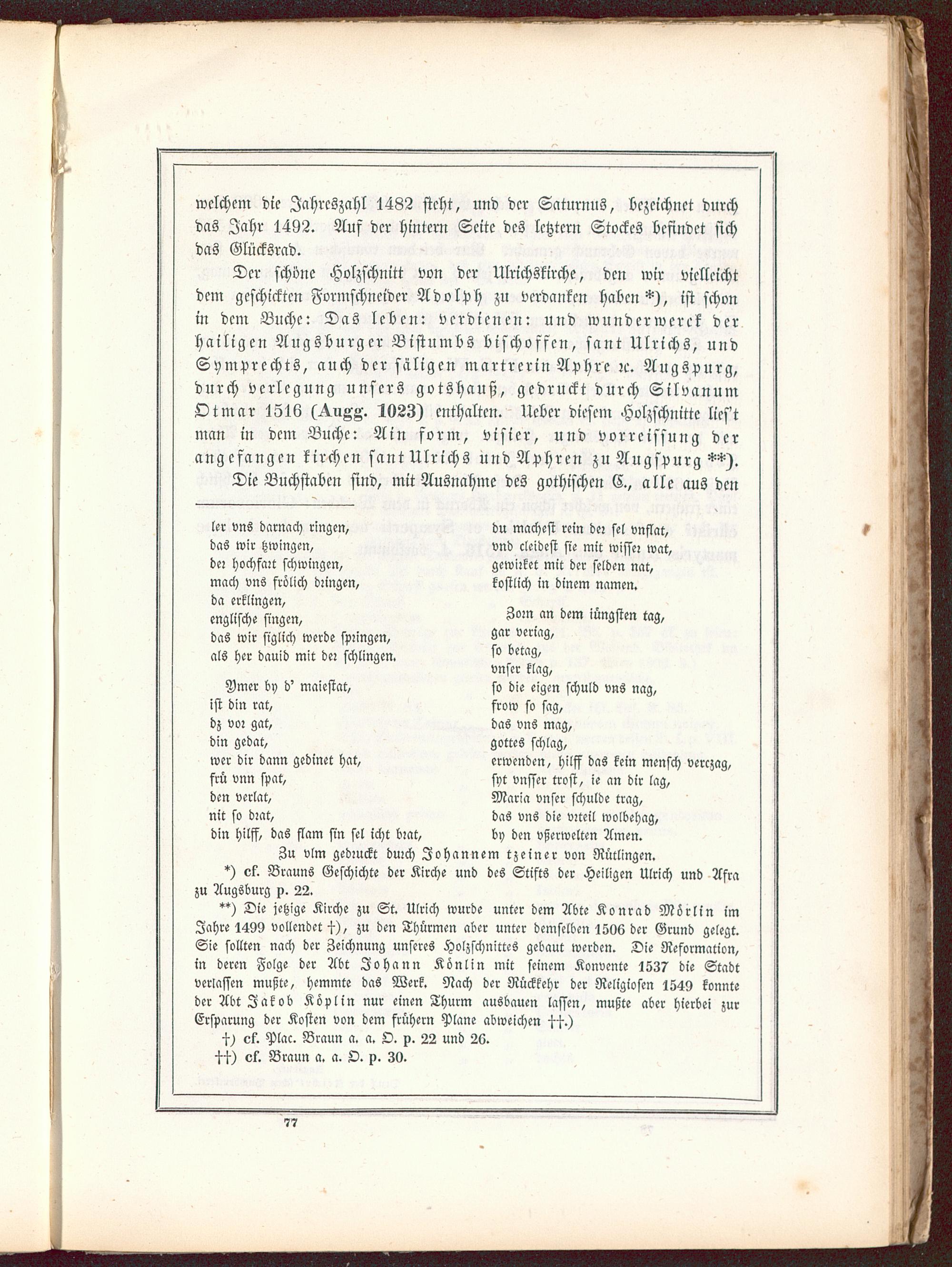 Der schone Holzschnitt von der Ulrichskirche, den wir vielleichtdem geschickten Formschneider Adolph zu verdanken Habens, ist schonin dem Buche: Das leben: verdienen: und wunderwerck derhailigen Augsburger Bistumbs bischoffen, sant Ulrichs, undSymprechts, auch der säligen martrerin Aphre :e. Augspurg,durch Verlegung unsers gotshauß, gedruckt durch SilvanumOtmar 1516 l>uKK. 2033) enthalten, lieber diesem Holzschnitte liestman in dem Buche: Ain form, visier, und vorrcissung derangefangen kirchen sant Ulrichs und Aphren zu Augspurg