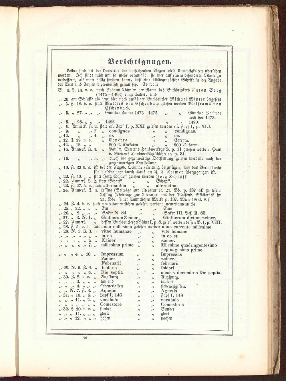 „ 26. „ 2. „ „ „ Becker ^. 84. „ „ Becker III. Lief. v. 85.„ 27. „ 3. 1. „ tZintKerum deiner „ „ (Zintlierum äietum sielner.„ 27. Anmerk. „ dessen Buchdruckergeschichte I> p. 8. geles. werden dessen B. I> p. VIII.„ 28. Z. 5. v. o. statt anno inillesimo gelesen werden anno eurrente millesimo.„ 28. ^lV. 3. Z. 3. „ vitao Iiumauao „ „ vite Kumans„ // // „ // /, „ in eo „ „ in eo et