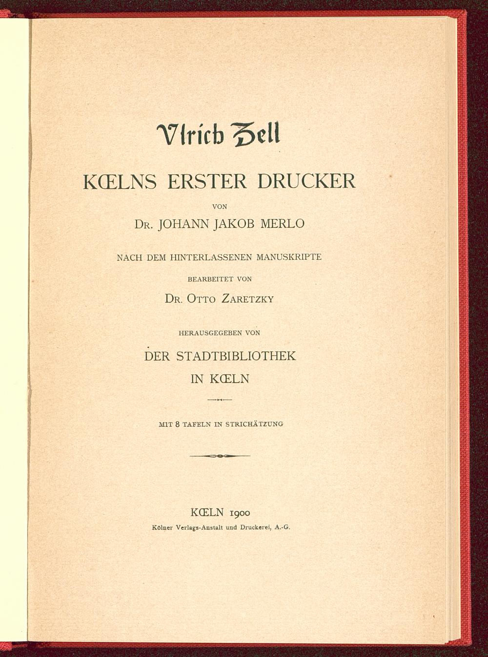T(ricb?5eUKCELNS ERSTER DRUCKERVONDr. JOHANN JAKOB MERLO NACH DEM HINTERLASSENEN MANUSKRIPTEBEARBEITET VONDr. Otto ZaretzkyHERAUSGEGEBEN VONDER STADTBIBLIOTHEKIN KCELNMIT 8 TAFELN IN STRICHÄTZUNGKCELN 1900Kölner Verlags-Anstalt und Druckerei, A.-G.