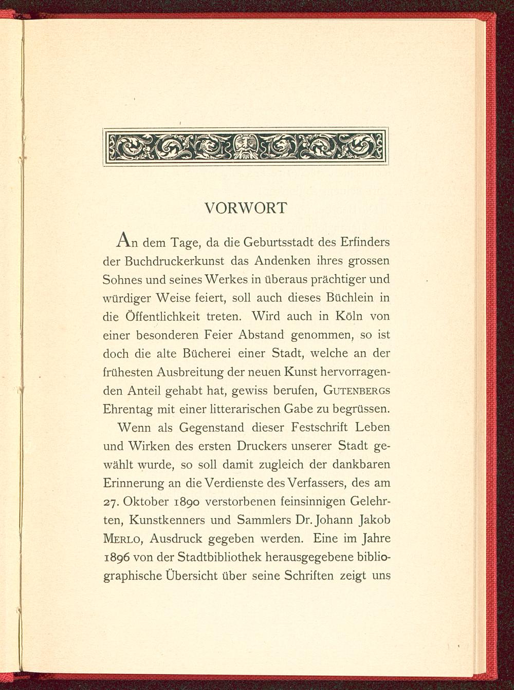 An dem Tage, da die Geburtsstadt des Erfindersder Buchdruckerkunst das Andenken ihres grossenSohnes und seines Werkes in überaus prächtiger undwürdiger Weise feiert, soll auch dieses Büchlein indie Öffentlichkeit treten. Wird auch in Köln voneiner besonderen Feier Abstand genommen, so istdoch die alte Bücherei einer Stadt, welche an derfrühesten Ausbreitung der neuen Kunst hervorragen-den Anteil gehabt hat, gewiss berufen, Gutenbergs Ehrentag mit einer litterarischen Gabe zu begrüssen.