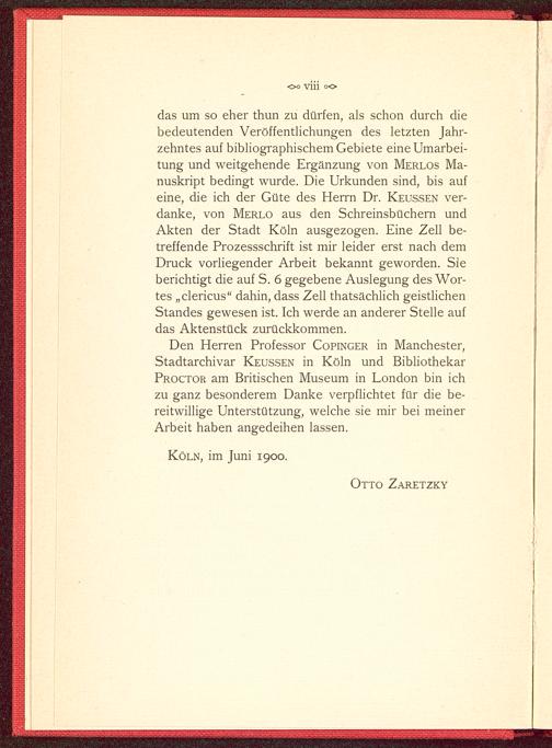 Den Herren Professor Copinger in Manchester ,Stadtarchivar Keussen in Köln und BibliothekarProctor am Britischen Museum in London bin ichzu ganz besonderem Danke verpflichtet für die be-reitwillige Unterstützung, welche sie mir bei meinerArbeit haben angedeihen lassen.