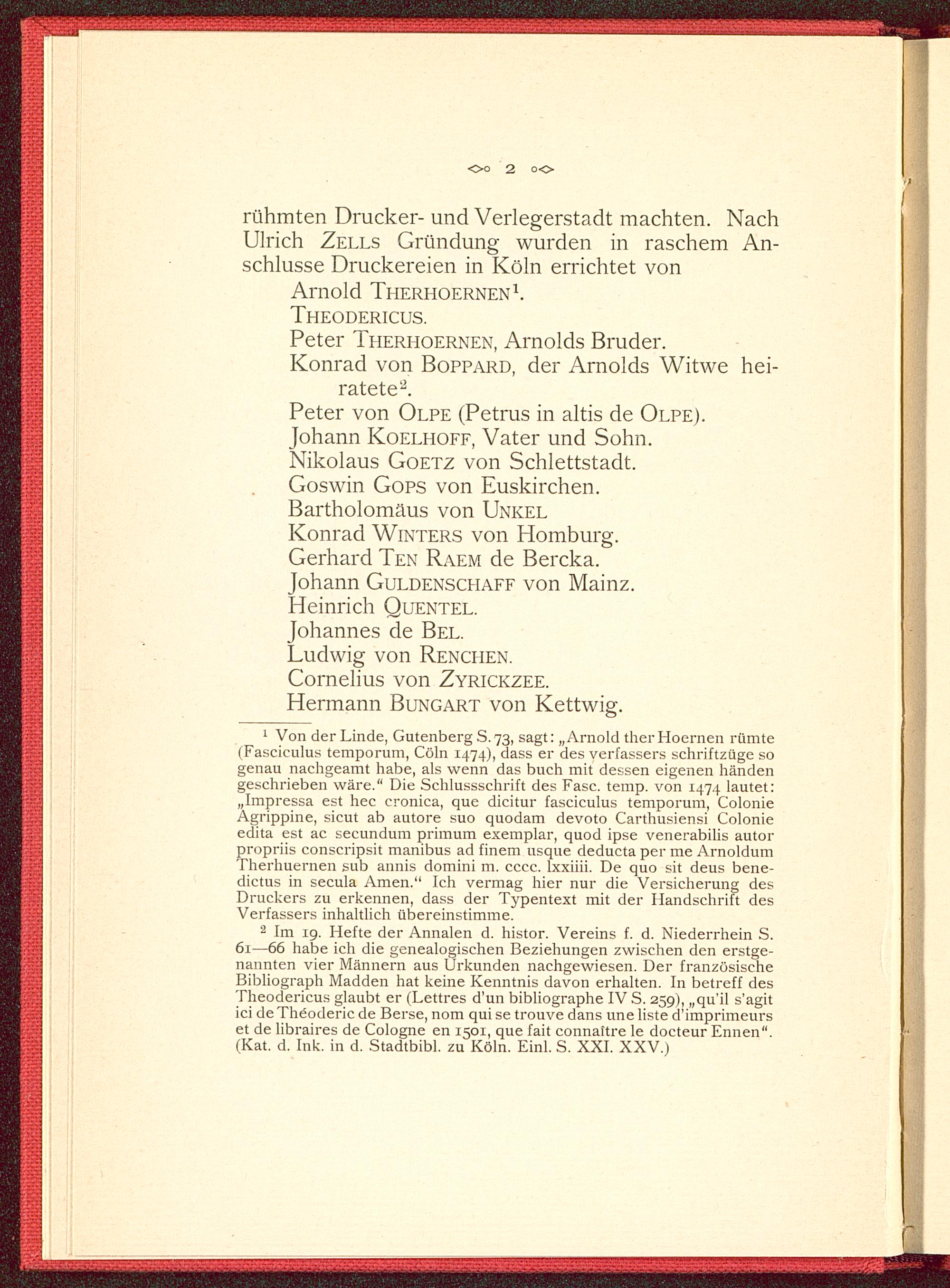 2 Im ig. Hefte der Annalen d. histor. Vereins f. d. Niederrhein S.61—66 habe ich die genealogischen Beziehungen zwischen den erstge-nannten vier Männern aus Urkunden nachgewiesen. Der französischeBibliograph Madden hat keine Kenntnis davon erhalten. In betreff desTheodericus glaubt er (Lettres d'un bibliographe IV S. 259), „qu'il s'agitici de Theoderic de Berse, nom qui se trouve dans une liste d'imprimeurset de libraires de Cologne en 1501, que fait connaltre le docteur Ennen".(Kat. d. Ink. in d. Stadtbibl. zu Köln. Einl. S. XXI. XXV.)