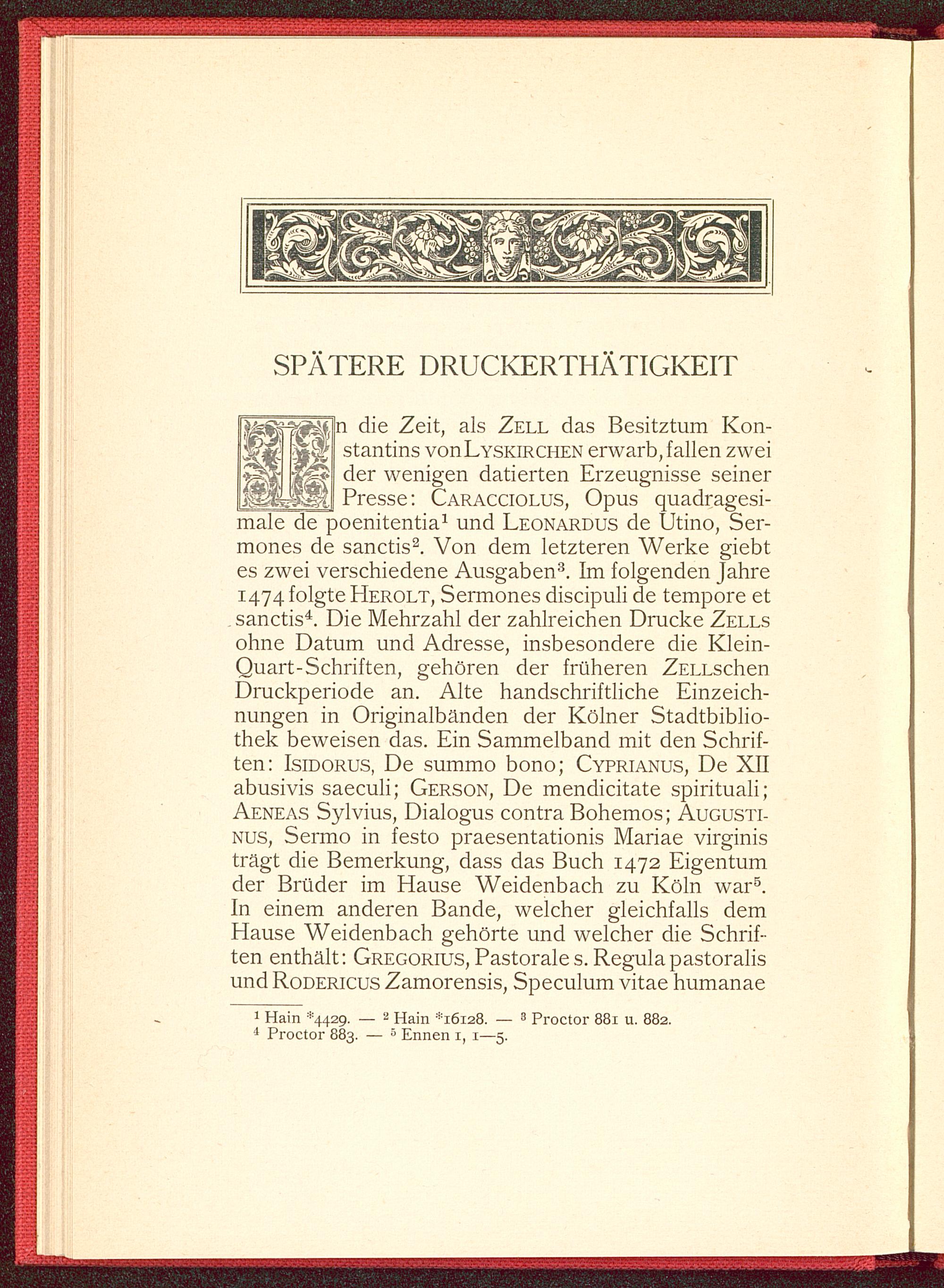 n die Zeit, als Zell das Besitztum Kon-stantins vonLYSKiRCHEN erwarb, fallen zweider wenigen datierten Erzeugnisse seinerPresse: Caracciolus, Opus quadragesi-male de poenitentia 1 und Leonardus de Utino, Ser-mones de sanctis 2 . Von dem letzteren Werke giebtes zwei verschiedene Ausgaben 3 . Im folgenden Jahre1474 folgte Herolt, Sermones discipuli de tempore etsanctis 4 . Die Mehrzahl der zahlreichen Drucke Zellsohne Datum und Adresse, insbesondere die Klein-Quart-Schriften, gehören der früheren ZELLschenDmckperiode an. Alte handschriftliche Einzeich-nungen in Originalbänden der Kölner Stadtbiblio-thek beweisen das. Ein Sammelband mit den Schrif-ten: Isidorus, De summo bono; Cyprianus, De XIIabusivis saeculi; Gerson, De mendicitate spirituali;Aeneas Sylvius, Dialogus contra Bohemos; Augusti-nus, Sermo in festo praesentationis Mariae virginisträgt die Bemerkung, dass das Buch 1472 Eigentumder Brüder im Hause Weidenbach zu Köln war 5 .In einem anderen Bande, welcher gleichfalls demHause Weidenbach gehörte und welcher die Schrif-ten enthält: Gregorius, Pastorales.Regulapastoralisund Rodericus Zamorensis, Speculum vitae humanae