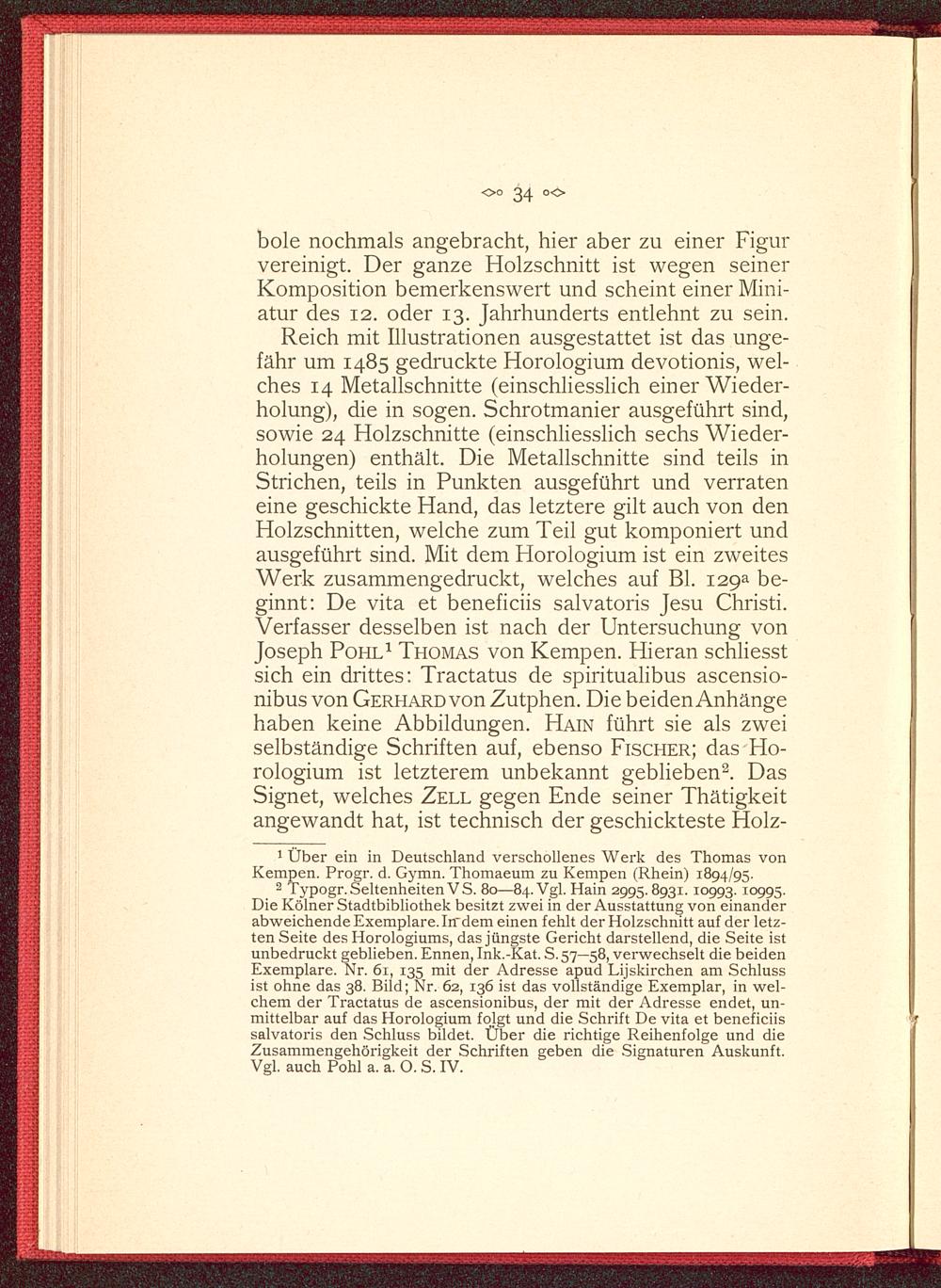Reich mit Illustrationen ausgestattet ist das unge-fähr um 1485 gedruckte Horologium devotionis, wel-ches 14 Metallschnitte (einschliesslich einer Wieder-holung), die in sogen. Schrotmanier ausgeführt sind,sowie 24 Holzschnitte (einschliesslich sechs Wieder-holungen) enthält. Die Metallschnitte sind teils inStrichen, teils in Punkten ausgeführt und verrateneine geschickte Hand, das letztere gilt auch von denHolzschnitten, welche zum Teil gut komponiert undausgeführt sind. Mit dem Horologium ist ein zweitesWerk zusammengedruckt, welches auf Bl. 129a be-ginnt: De vita et beneficiis salvatoris Jesu Christi.Verfasser desselben ist nach der Untersuchung vonJoseph Pohl 1 Thomas von Kempen. Hieran schliesstsich ein drittes: Tractatus de spiritualibus ascensio-nibus von Gerhard von Zutphen. Die beiden Anhängehaben keine Abbildungen. Hain führt sie als zweiselbständige Schriften auf, ebenso Fischer; das Ho-rologium ist letzterem unbekannt geblieben 2 . DasSignet, welches Zell gegen Ende seiner Thätigkeitangewandt hat, ist technisch der geschickteste Holz-