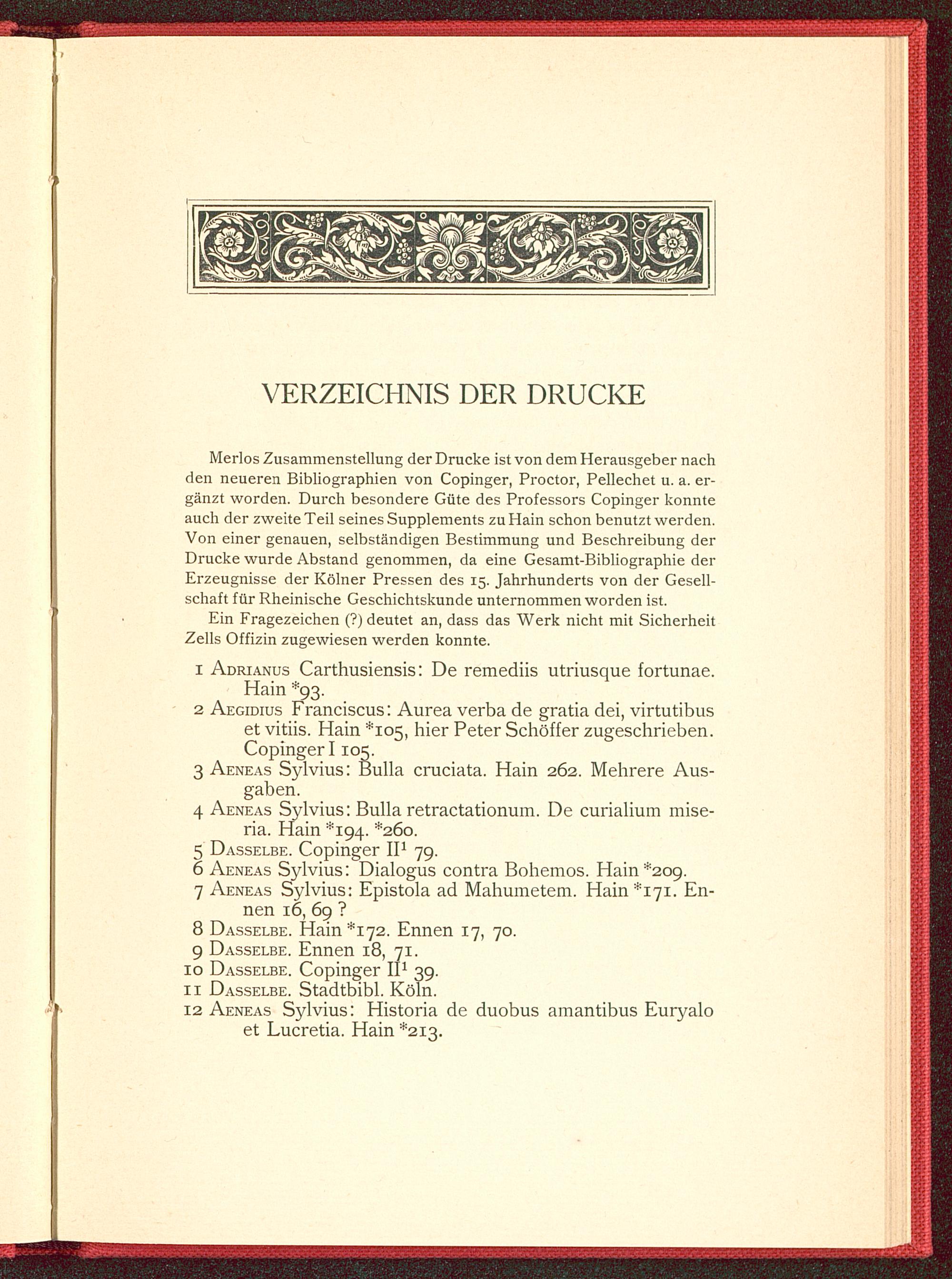 Merlos Zusammenstellung der Drucke ist von dem Herausgeber nachden neueren Bibliographien von Copinger, Proctor, Pellechet u. a. er-gänzt worden. Durch besondere Güte des Professors Copinger konnteauch der zweite Teil seines Supplements zu Hain schon benutzt werden.Von einer genauen, selbständigen Bestimmung und Beschreibung derDrucke wurde Abstand genommen, da eine Gesamt-Bibliographie derErzeugnisse der Kölner Pressen des 15. Jahrhunderts von der Gesell-schaft für Rheinische Geschichtskunde unternommen worden ist.