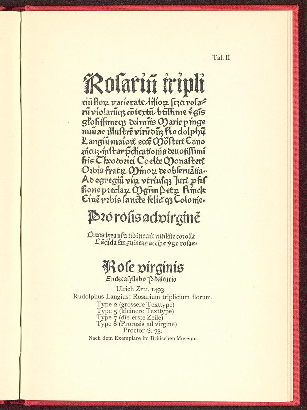 Ulrich Zell 1493.Rudolphus Langius: Rosarium triplicium florum.Type 2 (grössere Texttype)Type 5 (kleinere Texttype)Type 7 (die erste Zeile)Type 8 (Prorosis ad virgine)Proctor S. 73.Nach dem Exemplare im Britischen Museum.