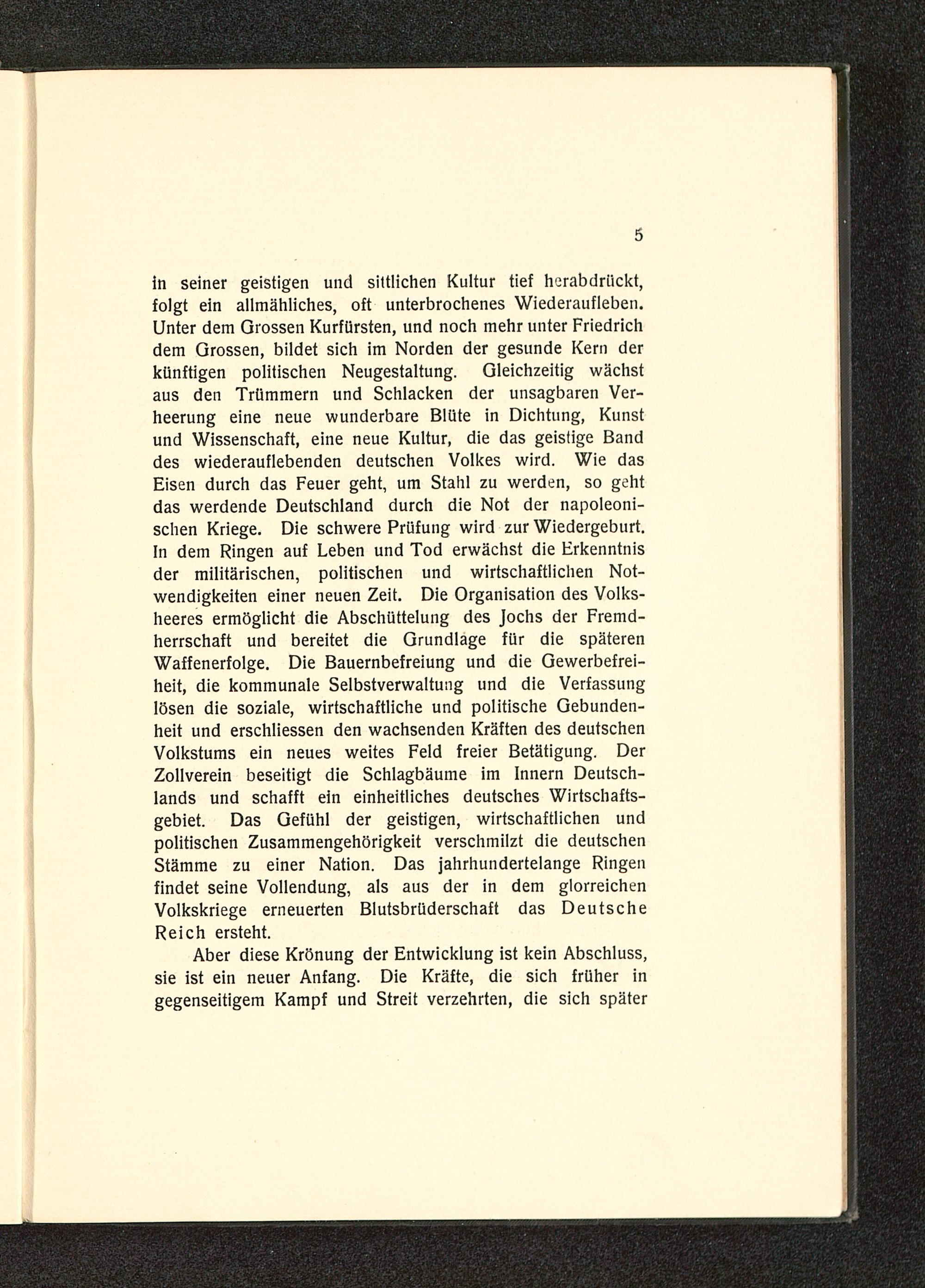 in seiner geistigen und sittlichen Kultur tief herabdrückt,folgt ein allmähliches, oft unterbrochenes Wiederaufleben.Unter dem Grossen Kurfürsten, und noch mehr unter Friedrichdem Grossen, bildet sich im Norden der gesunde Kern derkünftigen politischen Neugestaltung. Gleichzeitig wächstaus den Trümmern und Schlacken der unsagbaren Ver-heerung eine neue wunderbare Blüte in Dichtung, Kunstund Wissenschaft, eine neue Kultur, die das geistige Banddes wiederauflebenden deutschen Volkes wird. Wie dasEisen durch das Feuer geht, um Stahl zu werden, so gehtdas werdende Deutschland durch die Not der napoleoni-schen Kriege. Die schwere Prüfung wird zur Wiedergeburt.In dem Ringen auf Leben und Tod erwächst die Erkenntnisder militärischen, politischen und wirtschaftlichen Not-wendigkeiten einer neuen Zeit. Die Organisation des Volks-heeres ermöglicht die Abschüttelung des Jochs der Fremd-herrschaft und bereitet die Grundlage für die späterenWaffenerfolge. Die Bauernbefreiung und die Gewerbefrei-heit, die kommunale Selbstverwaltung und die Verfassunglösen die soziale, wirtschaftliche und politische Gebunden-heit und erschliessen den wachsenden Kräften des deutschenVolkstums ein neues weites Feld freier Betätigung. DerZollverein beseitigt die Schlagbäume im Innern Deutsch-lands und schafft ein einheitliches deutsches Wirtschafts- gebiet.