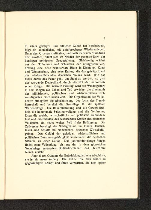 Das Gefühl der geistigen, wirtschaftlichen undpolitischen Zusammengehörigkeit verschmilzt die deutschenStämme zu einer Nation. Das jahrhundertelange Ringenfindet seine Vollendung, als aus der in dem glorreichenVolkskriege erneuerten Blutsbrüderschaft das D e u t s c h eR e i c h ersteht.