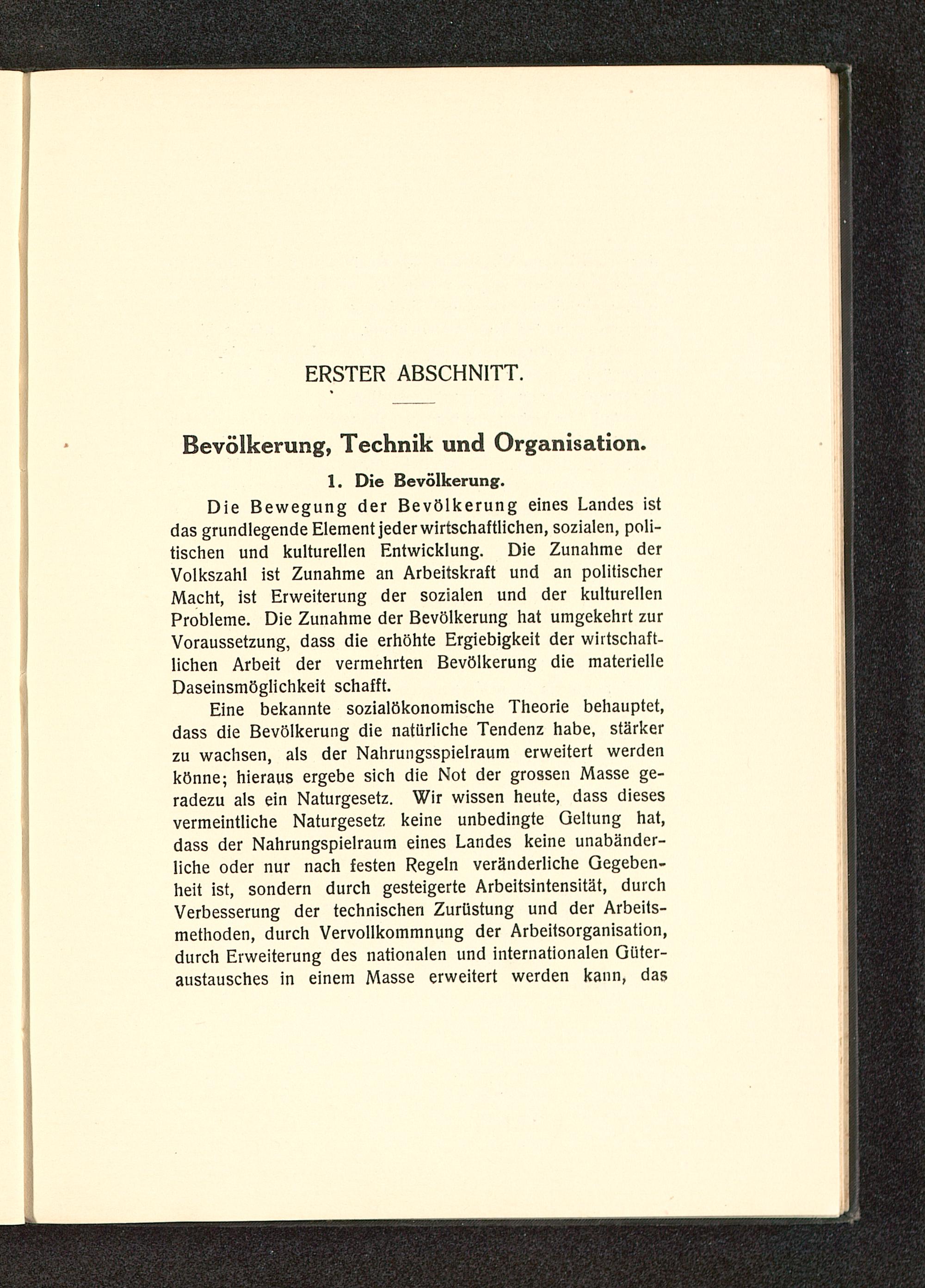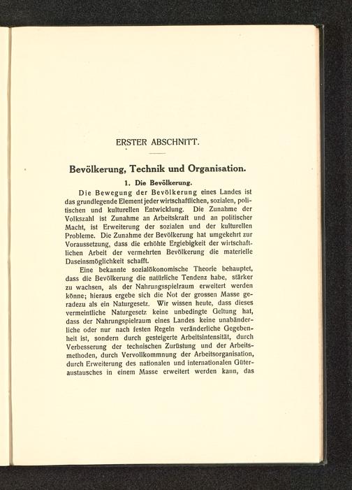 Eine bekannte sozialökonomische Theorie behauptet,dass die Bevölkerung die natürliche Tendenz habe, stärkerzu wachsen, als der Nahrungsspielraum erweitert werdenkönne; hieraus ergebe sich die Not der grossen Masse ge-radezu als ein Naturgesetz. Wir wissen heute, dass diesesvermeintliche Naturgesetz keine unbedingte Geltung hat,dass der Nahrungspielraum eines Landes keine unabänder-liche oder nur nach festen Regeln veränderliche Gegeben-heit ist, sondern durch gesteigerte Arbeitsintensität, durchVerbesserung der technischen Zurüstung und der Arbeits-methoden, durch Vervollkommnung der Arbeitsorganisation,durch Erweiterung des nationalen und internationalen Güter-austausches in einem Masse erweitert werden kann, das