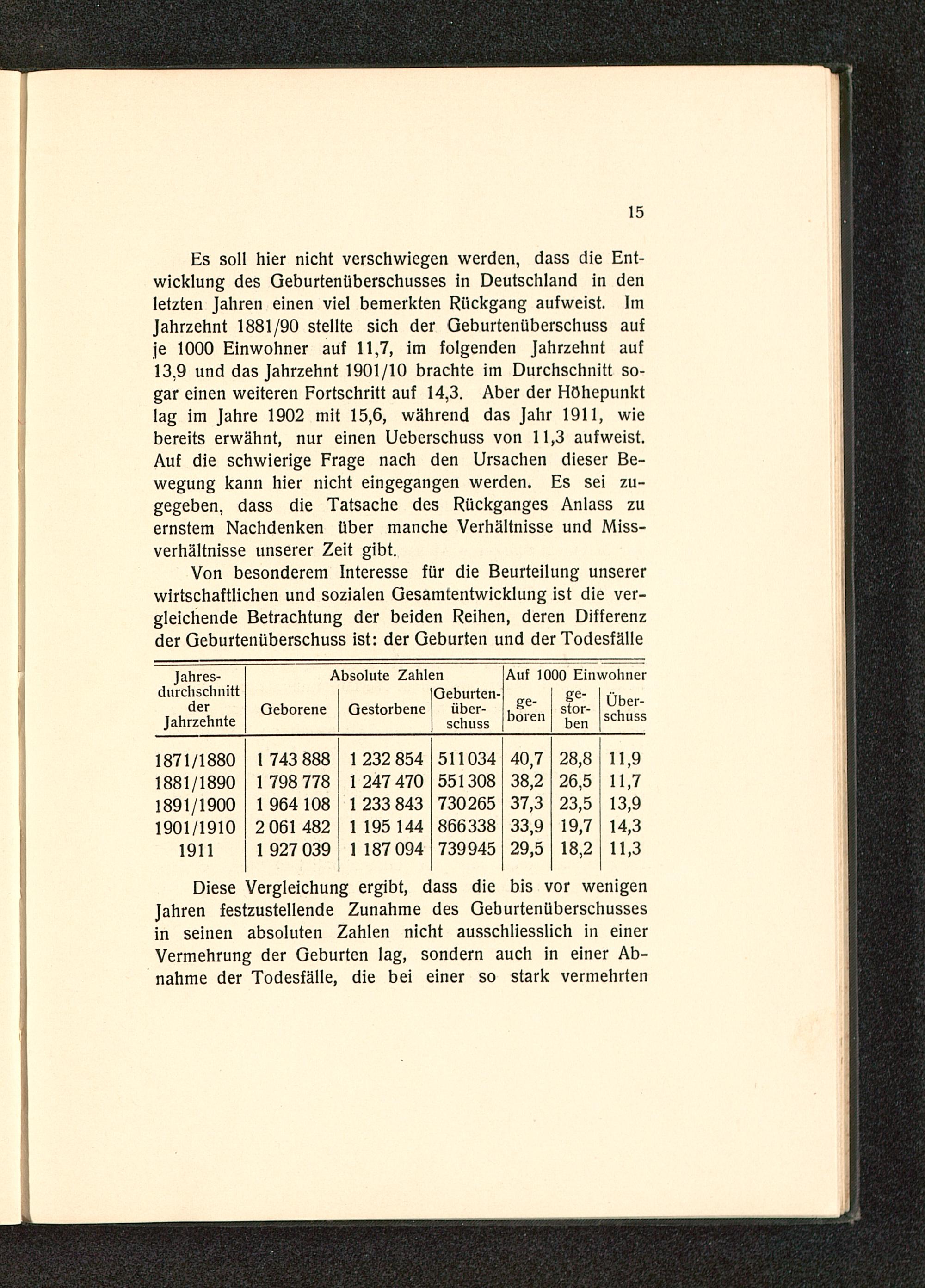 Von besonderem Interesse für die Beurteilung unsererwirtschaftlichen und sozialen Gesamtentwicklung ist die ver-gleichende Betrachtung der beiden Reihen, deren Differenzder Geburtenüberschuss ist: der Geburten und der Todesfälle