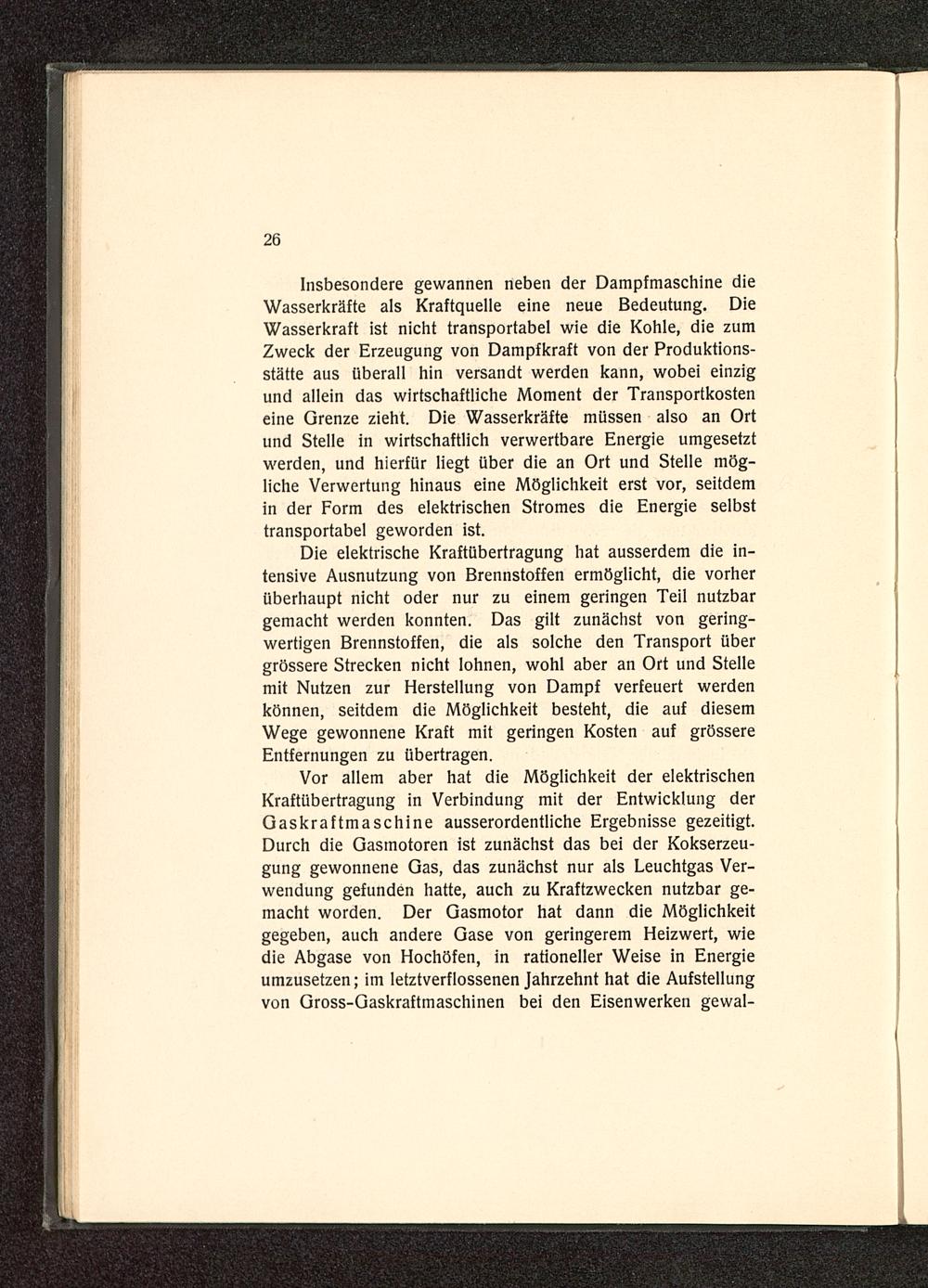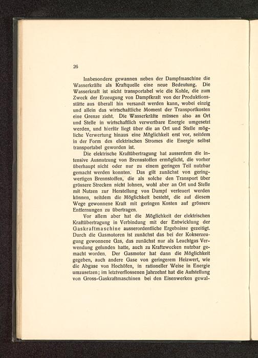 Insbesondere gewannen neben der Dampfmaschine dieWasserkräfte als Kraftquelle eine neue Bedeutung. DieWasserkraft ist nicht transportabel wie die Kohle, die zumZweck der Erzeugung von Dampfkraft von der Produktions-stätte aus überall hin versandt werden kann, wobei einzigund allein das wirtschaftliche Moment der Transportkosteneine Grenze zieht. Die Wasserkräfte müssen also an Ortund Stelle in wirtschaftlich verwertbare Energie umgesetztwerden, und hierfür liegt über die an Ort und Stelle mög-liche Verwertung hinaus eine Möglichkeit erst vor, seitdemin der Form des elektrischen Stromes die Energie selbsttransportabel geworden ist.