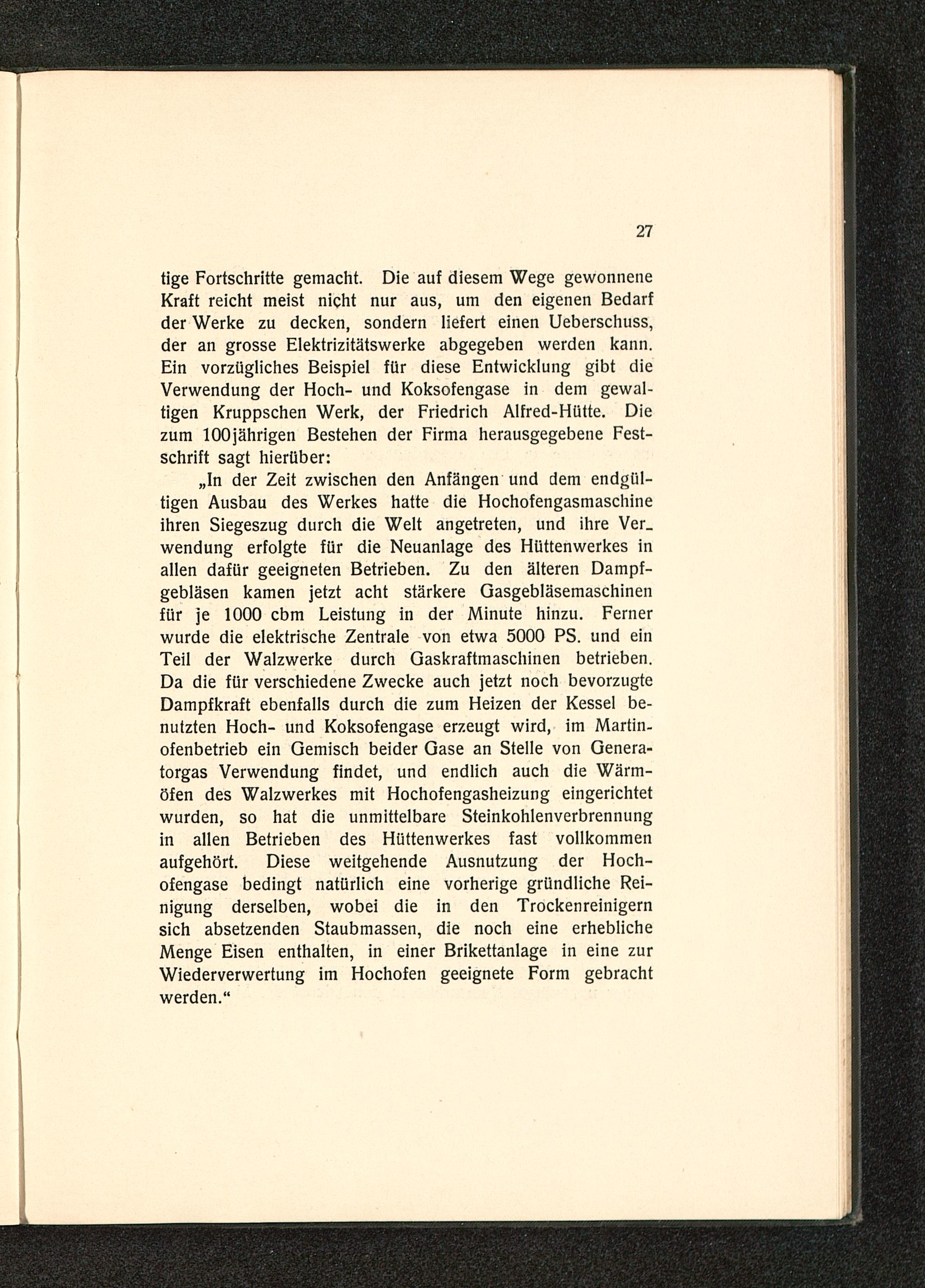 tige Fortschritte gemacht. Die auf diesem Wege gewonneneKraft reicht meist nicht nur aus, um den eigenen Bedarfder Werke zu decken, sondern liefert einen Ueberschuss,der an grosse Elektrizitätswerke abgegeben werden kann.Ein vorzügliches Beispiel für diese Entwicklung gibt dieVerwendung der Hoch- und Koksofengase in dem gewal-tigen Kruppschen Werk, der Friedrich Alfred-Hütte. Diezum 100jährigen Bestehen der Firma herausgegebene Fest-schrift sagt hierüber: