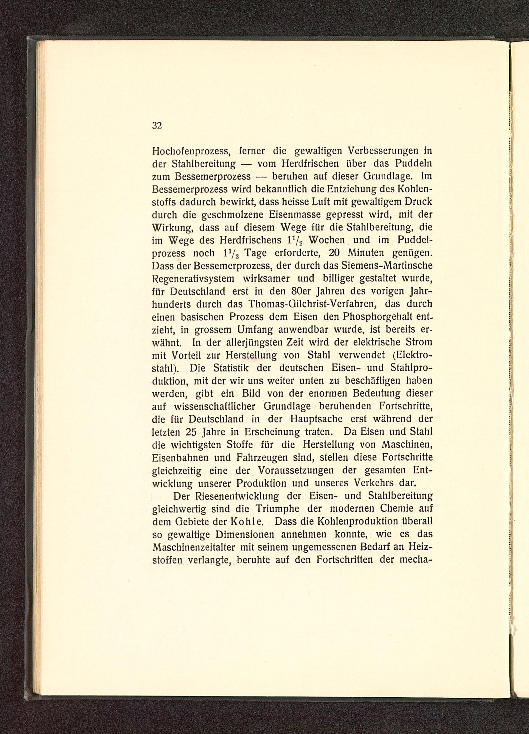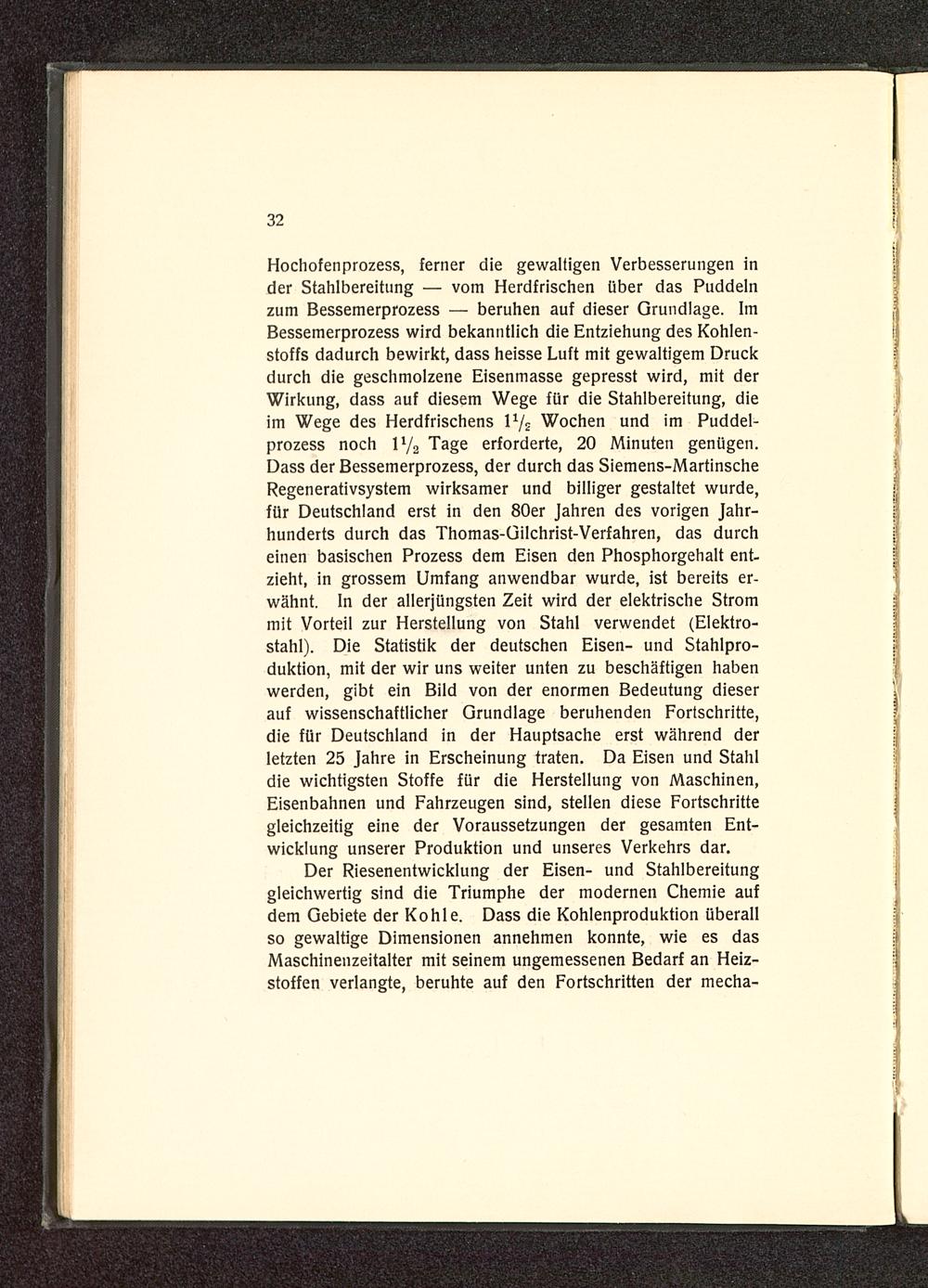 Hochofenprozess, ferner die gewaltigen Verbesserungen inder Stahlbereitung — vom Herdfrischen über das Puddelnzum Bessemerprozess — beruhen auf dieser Grundlage. ImBessemerprozess wird bekanntlich die Entziehung des Kohlen-stoffs dadurch bewirkt, dass heisse Luft mit gewaltigem Druckdurch die geschmolzene Eisenmasse gepresst wird, mit derWirkung, dass auf diesem Wege für die Stahlbereitung, dieim Wege des Herdfrischens 1½ Wochen und im Puddel-prozess noch 1½ Tage erforderte, 20 Minuten genügen.Dass der Bessemerprozess, der durch das Siemens-MartinscheRegenerativsystem wirksamer und billiger gestaltet wurde,für Deutschland erst in den 80er Jahren des vorigen Jahr-hunderts durch das Thomas-Gilchrist-Verfahren, das durcheinen basischen Prozess dem Eisen den Phosphorgehalt ent-zieht, in grossem Umfang anwendbar wurde, ist bereits er-wähnt. In der allerjüngsten Zeit wird der elektrische Strommit Vorteil zur Herstellung von Stahl verwendet (Elektro-stahl). Die Statistik der deutschen Eisen- und Stahlpro-duktion, mit der wir uns weiter unten zu beschäftigen habenwerden, gibt ein Bild von der enormen Bedeutung dieserauf wissenschaftlicher Grundlage beruhenden Fortschritte,die für Deutschland in der Hauptsache erst während derletzten 25 Jahre in Erscheinung traten. Da Eisen und Stahldie wichtigsten Stoffe für die Herstellung von Maschinen,Eisenbahnen und Fahrzeugen sind, stellen diese Fortschrittegleichzeitig eine der Voraussetzungen der gesamten Ent-wicklung unserer Produktion und unseres Verkehrs dar.
