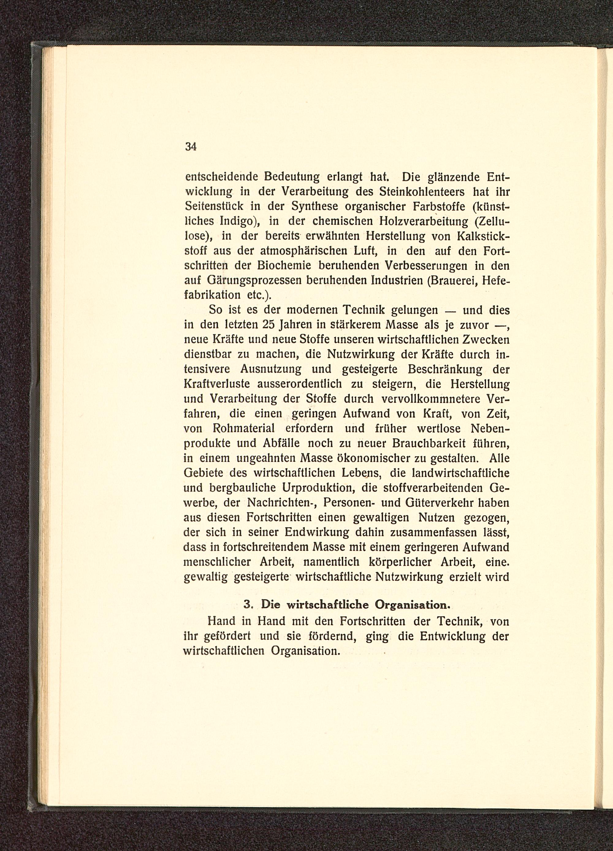 entscheidende Bedeutung erlangt hat . Die glänzende Ent-wicklung in der Verarbeitung des Steinkohlenteers hat ihrSeitenstück in d er Synthese organischer Farbstoffe ( künst-liches Indigo ) , in der chemischen Holzverarbeitung ( Zellu-los e ) , in der bereits erwähnten Herstellung von Kalkstick-stoff aus der atmosphärischen Luft , in den auf den Fort-schritten der Biochemie beruhenden Verbesserungen in denauf Gärungsprozessen beruhenden Industrien ( Brauerei , Hefe-fabrikation etc . ) .