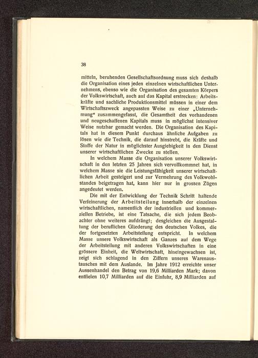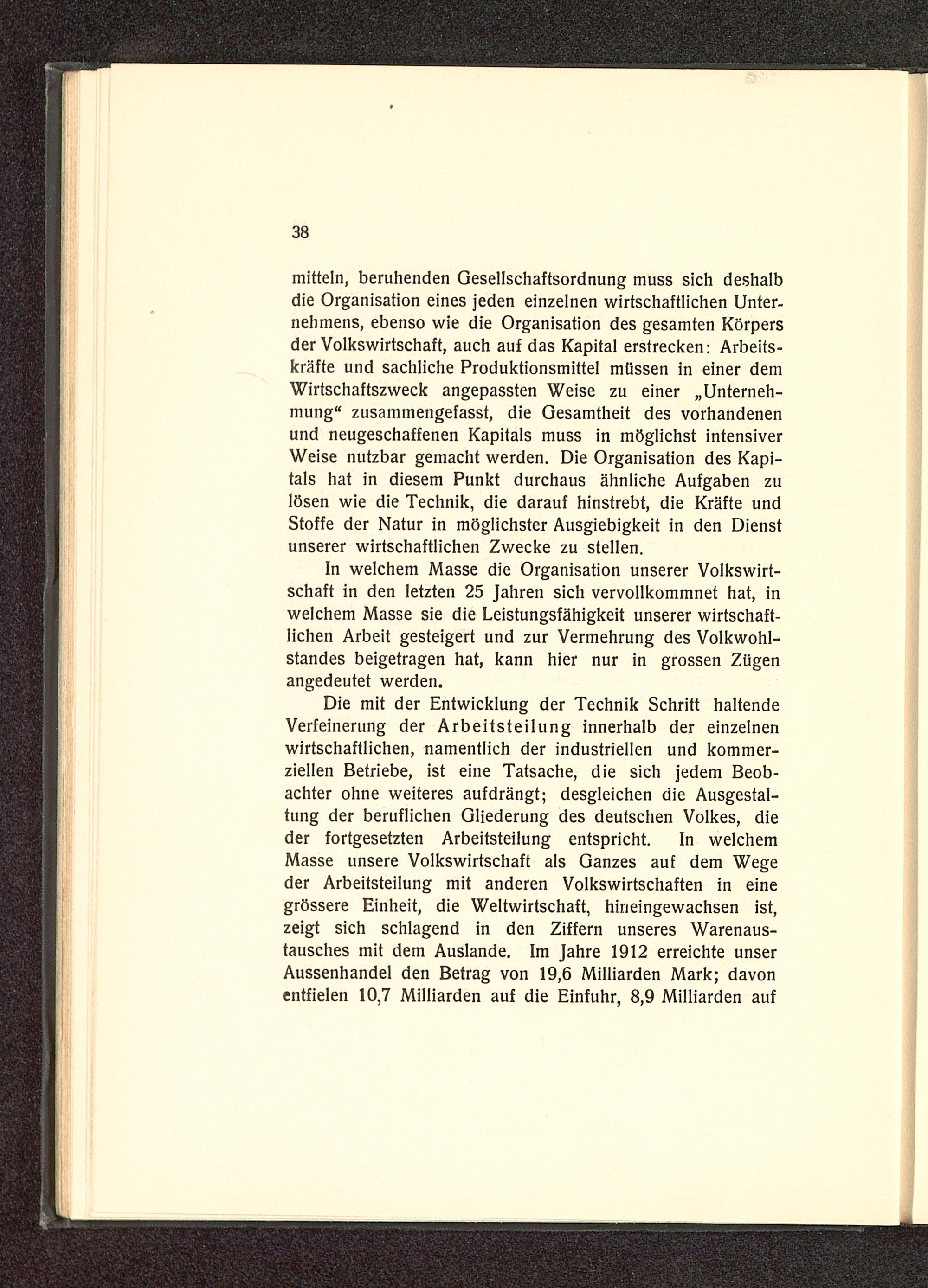 Die mit der Entwicklung der Technik Schritt haltendeVerfeinerung der Arbeitsteilung innerhalb der einzelnenwirtschaftlichen, namentlich der industriellen und kommer-ziellen Betriebe, ist eine Tatsache, die sich jedem Beob-achter ohne weiteres aufdrängt; desgleichen die Ausgestal-tung der beruflichen Gliederung des deutschen Volkes, dieder fortgesetzten Arbeitsteilung entspricht. In welchemMasse unsere Volkswirtschaft als Ganzes auf dem Wegeder Arbeitsteilung mit anderen Volkswirtschaften in einegrössere Einheit, die Weltwirtschaft, hineingewachsen ist,zeigt sich schlagend in den Ziffern unseres Warenaus-tausches mit dem Auslande. Im Jahre 1912 erreichte unserAussenhandel den Betrag von 19,6 Milliarden Mark; davonentfielen 10,7 Milliarden auf die Einfuhr, 8,9 Milliarden auf