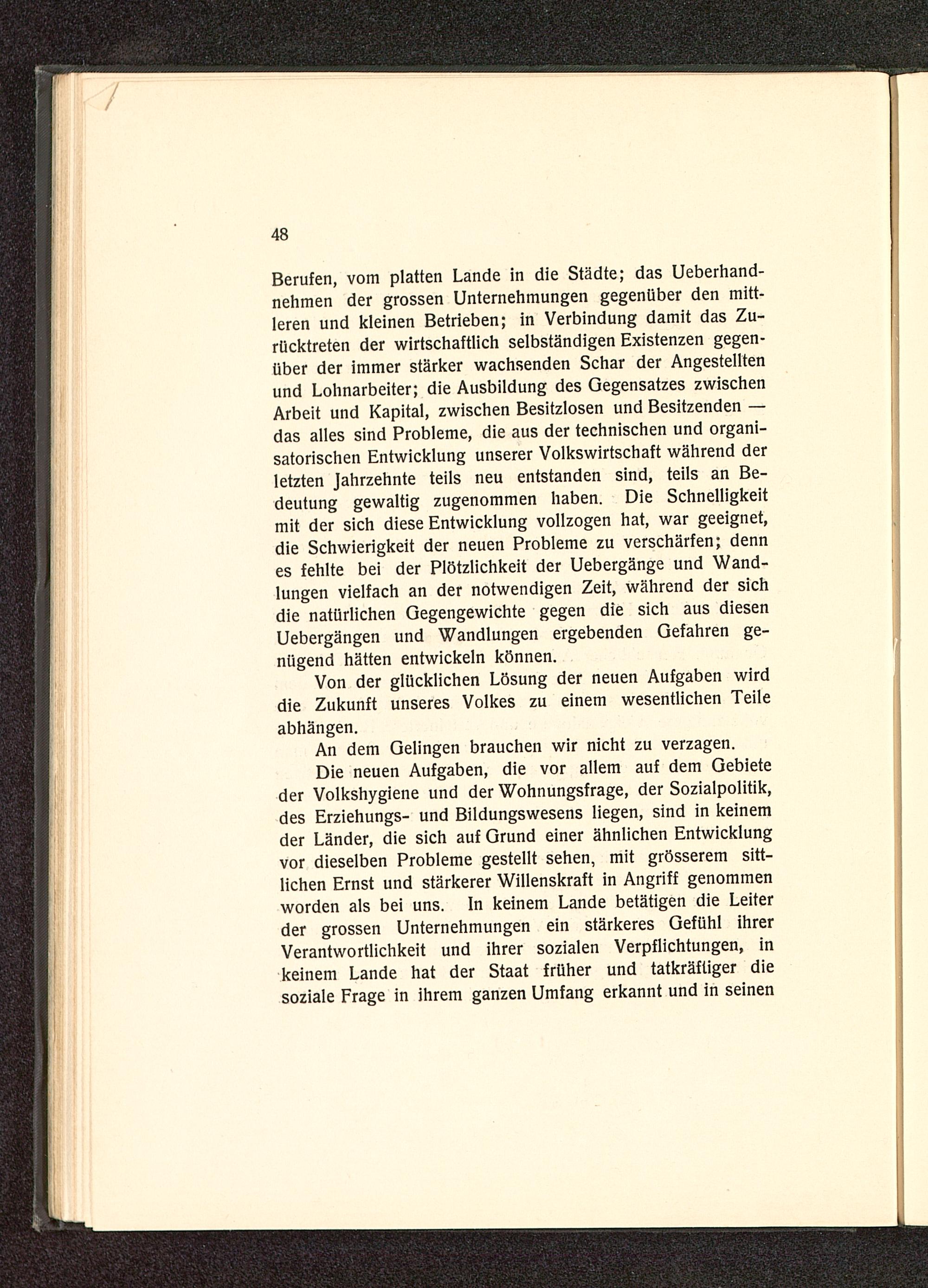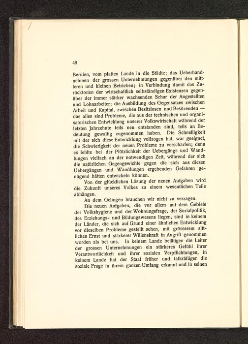 Die neuen Aufgaben, die vor allem auf dem Gebieteder Volkshygiene und der Wohnungsfrage, der Sozialpolitik,des Erziehungs- und Bildungswesens liegen, sind in keinemder Länder, die sich auf Grund einer ähnlichen Entwicklungvor dieselben Probleme gestellt sehen, mit grösserem sitt-lichen Ernst und stärkerer Willenskraft in Angriff genommenworden als bei uns. In keinem Lande betätigen die Leiterder grossen Unternehmungen ein stärkeres Gefühl ihrerVerantwortlichkeit und ihrer sozialen Verpflichtungen, inkeinem Lande hat der Staat früher und tatkräftiger diesoziale Frage in ihrem ganzen Umfang erkannt und in seinen