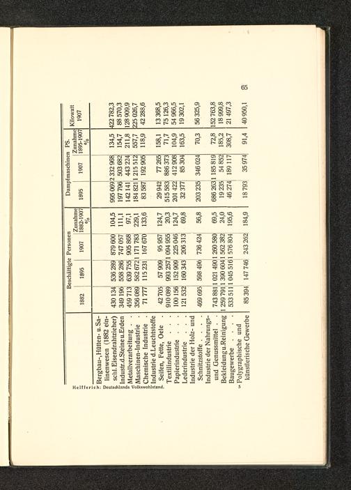 Bergbau-, Hütten- u.Sa-linenwesen (1882 ein-schl. Eisendrahtzieher) 430 134 536 289 879 600 104,5 995 0692 332 968 134,5 422 782,3Industr.d.Steine u.Erden 349 196 558 286 747 057 111,1 197 796 503 682 154,7 88 570,3Metallverarbeitung 459 713 639 755 905 868 97,1 142 141 443 224) 211,8 128 909,9Maschinen-Industrie 356 089 582 6721 171 783 229,1 184 8211 215 512 557,7 225 026,7Chemische Industrie 71 777 115 231 167 670 133,6 83 587 192 905 118,9 42 288,6Industrie d.LeuchtstoffeSeifen, Fette, Oele 42 705 57 909 95 957 124,7 29 942 77 265 158,1 13 368,5Textilindustrie