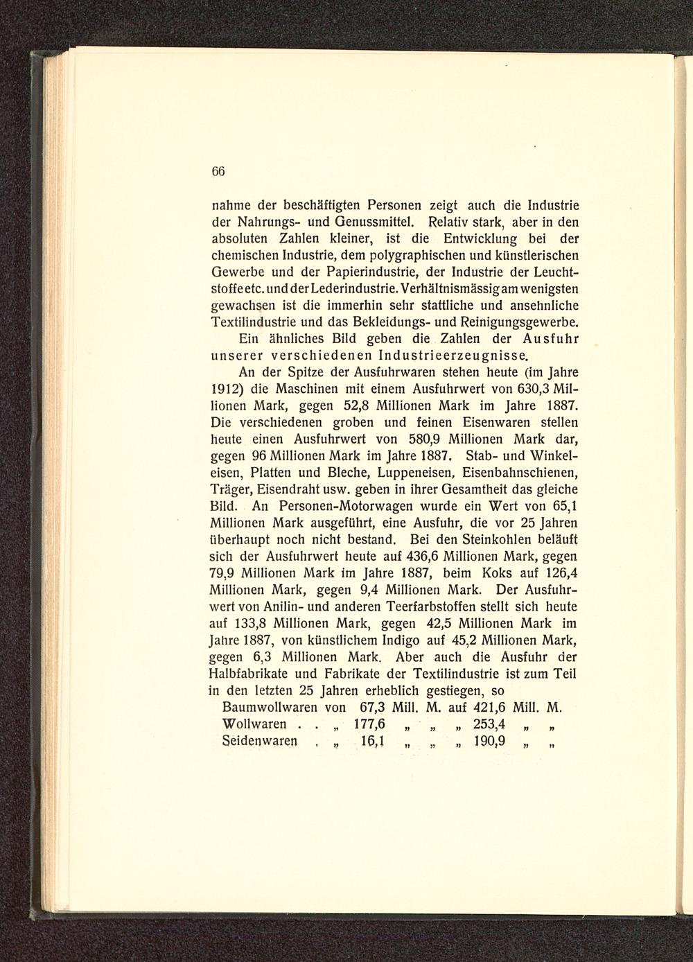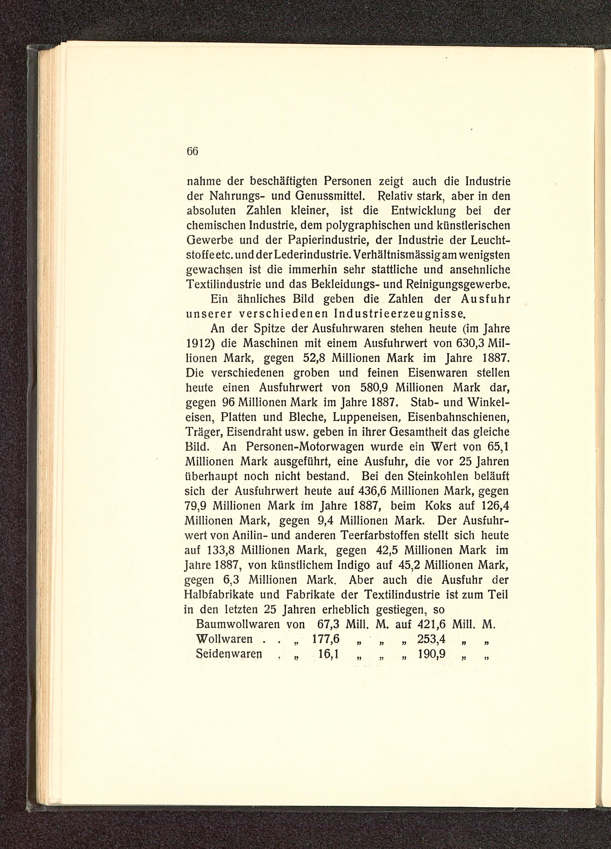 An der Spitze der Ausfuhrwaren stehen heute (im Jahre1912) die Maschinen mit einem Ausfuhrwert von 630,3 Mil-lionen Mark, gegen 52,8 Millionen Mark im Jahre 1887.Die verschiedenen groben und feinen Eisenwaren stellenheute einen Ausfuhrwert von 580,9 Millionen Mark dar,gegen 96 Millionen Mark im Jahre 1887. Stab- und Winkel-eisen, Platten und Bleche, Luppeneisen, Eisenbahnschienen,Träger, Eisendraht usw. geben in ihrer Gesamtheit das gleicheBild. An Personen-Motorwagen wurde ein Wert von 65,1Millionen Mark ausgeführt, eine Ausfuhr, die vor 25 Jahrenüberhaupt noch nicht bestand. Bei den Steinkohlen beläuftsich der Ausfuhrwert heute auf 436,6 Millionen Mark, gegen79,9 Millionen Mark im Jahre 1887, beim Koks auf 126,4Millionen Mark, gegen 9,4 Millionen Mark. Der Ausfuhr-wert von Anilin- und anderen Teerfarbstoffen stellt sich heuteauf 133,8 Millionen Mark, gegen 42,5 Millionen Mark imJahre 1887, von künstlichem Indigo auf 45,2 Millionen Mark,gegen 6,3 Millionen Mark. Aber auch die Ausfuhr derHalbfabrikate und Fabrikate der Textilindustrie ist zum Teilin den letzten 25 Jahren erheblich gestiegen, so