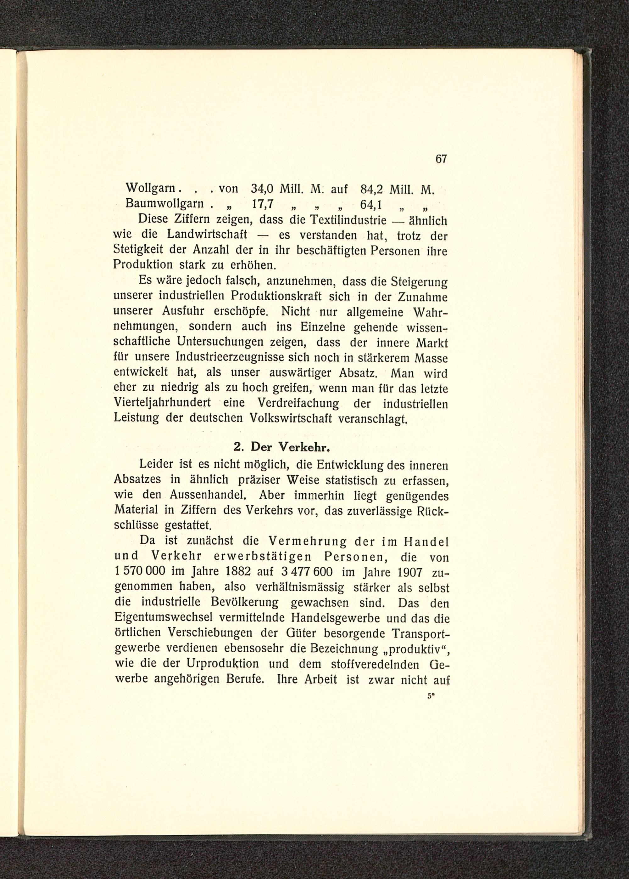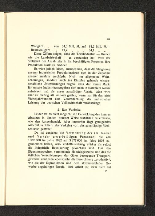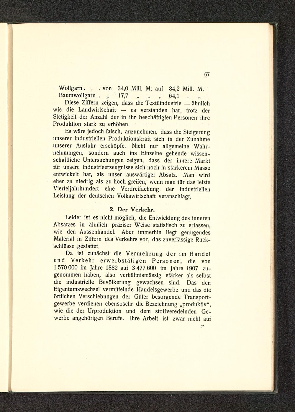 Es wäre jedoch falsch, anzunehmen, dass die Steigerungunserer industriellen Produktionskraft sich in der Zunahmeunserer Ausfuhr erschöpfe. Nicht nur allgemeine Wahr-nehmungen, sondern auch ins Einzelne gehende wissen-schaftliche Untersuchungen zeigen, dass der innere Marktfür unsere Industrieerzeugnisse sich noch in stärkerem Masseentwickelt hat, als unser auswärtiger Absatz. Man wirdeher zu niedrig als zu hoch greifen, wenn man für das letzteVierteljahrhundert eine Verdreifachung der industriellenLeistung der deutschen Volkswirtschaft veranschlagt.