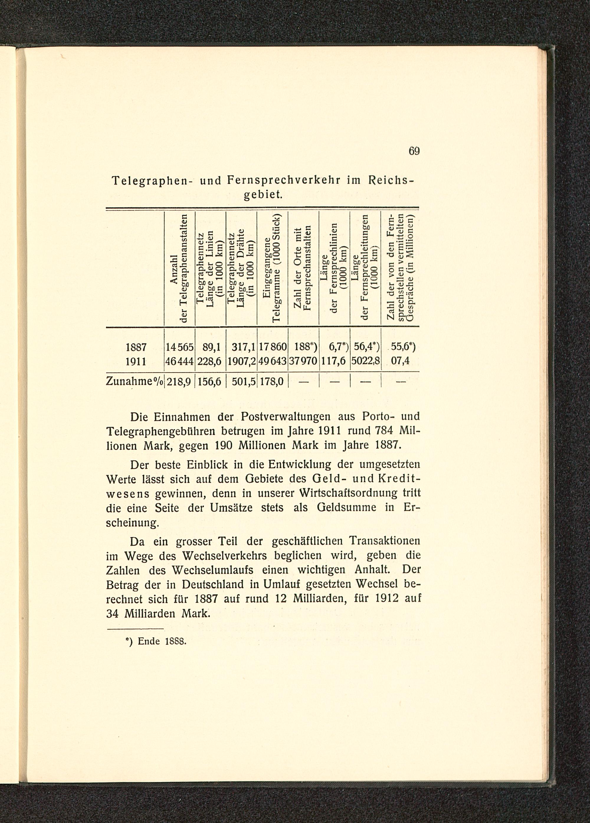 Da ein grosser Teil der geschäftlichen Transaktionenim Wege des Wechselverkehrs beglichen wird, geben dieZahlen des Wechselumlaufs einen wichtigen Anhalt. DerBetrag der in Deutschland in Umlauf gesetzten Wechsel be-rechnet sich für 1887 auf rund 12 Milliarden, für 1912 auf34 Milliarden Mark.