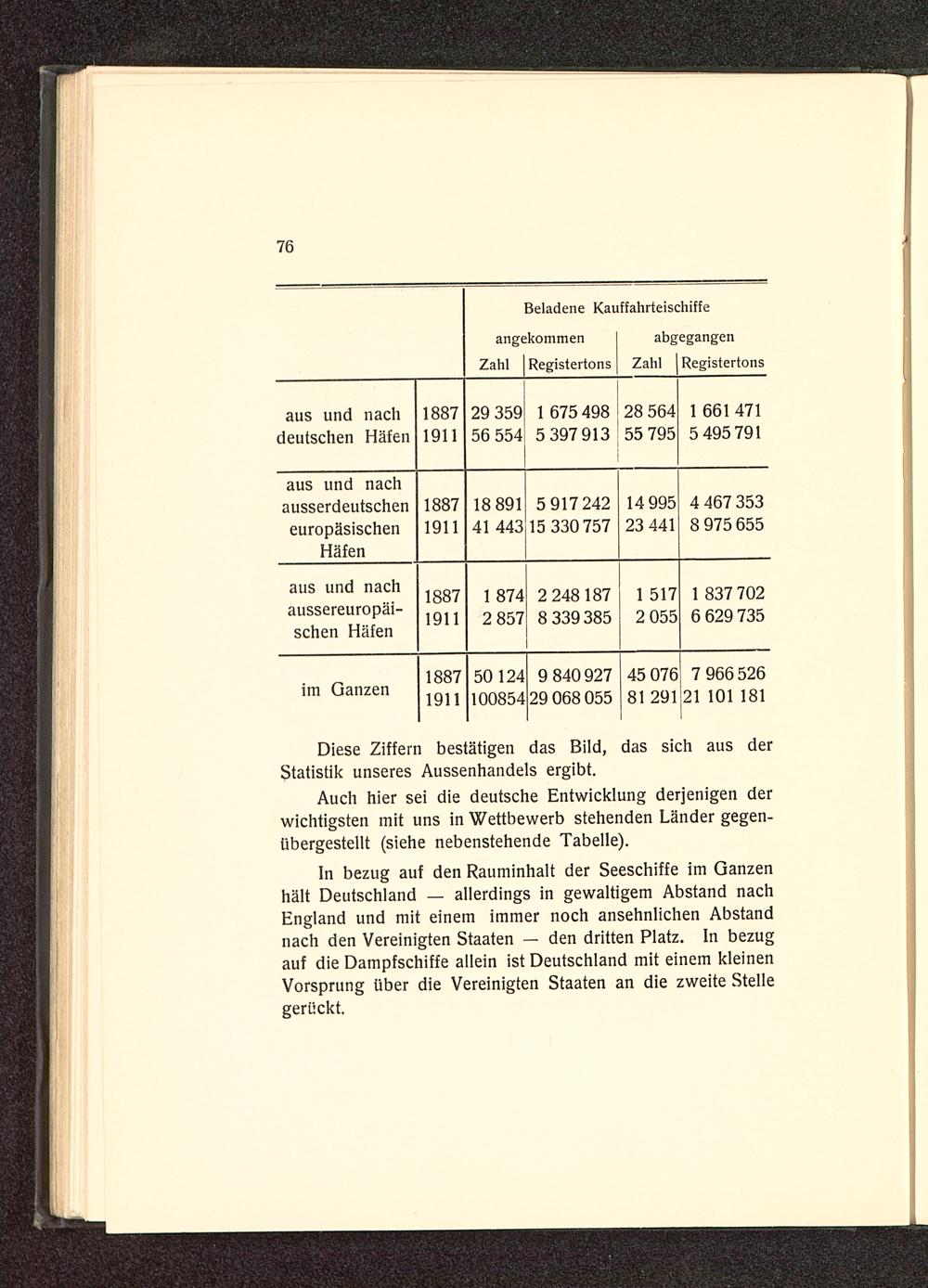 In bezug auf den Rauminhalt der Seeschiffe im Ganzenhält Deutschland – allerdings in gewaltigem Abstand nachEngland und mit einem immer noch ansehnlichen Abstandnach den Vereinigten Staaten – den dritten Platz. In bezugauf die Dampfschiffe allein ist Deutschland mit einem kleinenVorsprung über die Vereinigten Staaten an die zweite Stellegerückt.