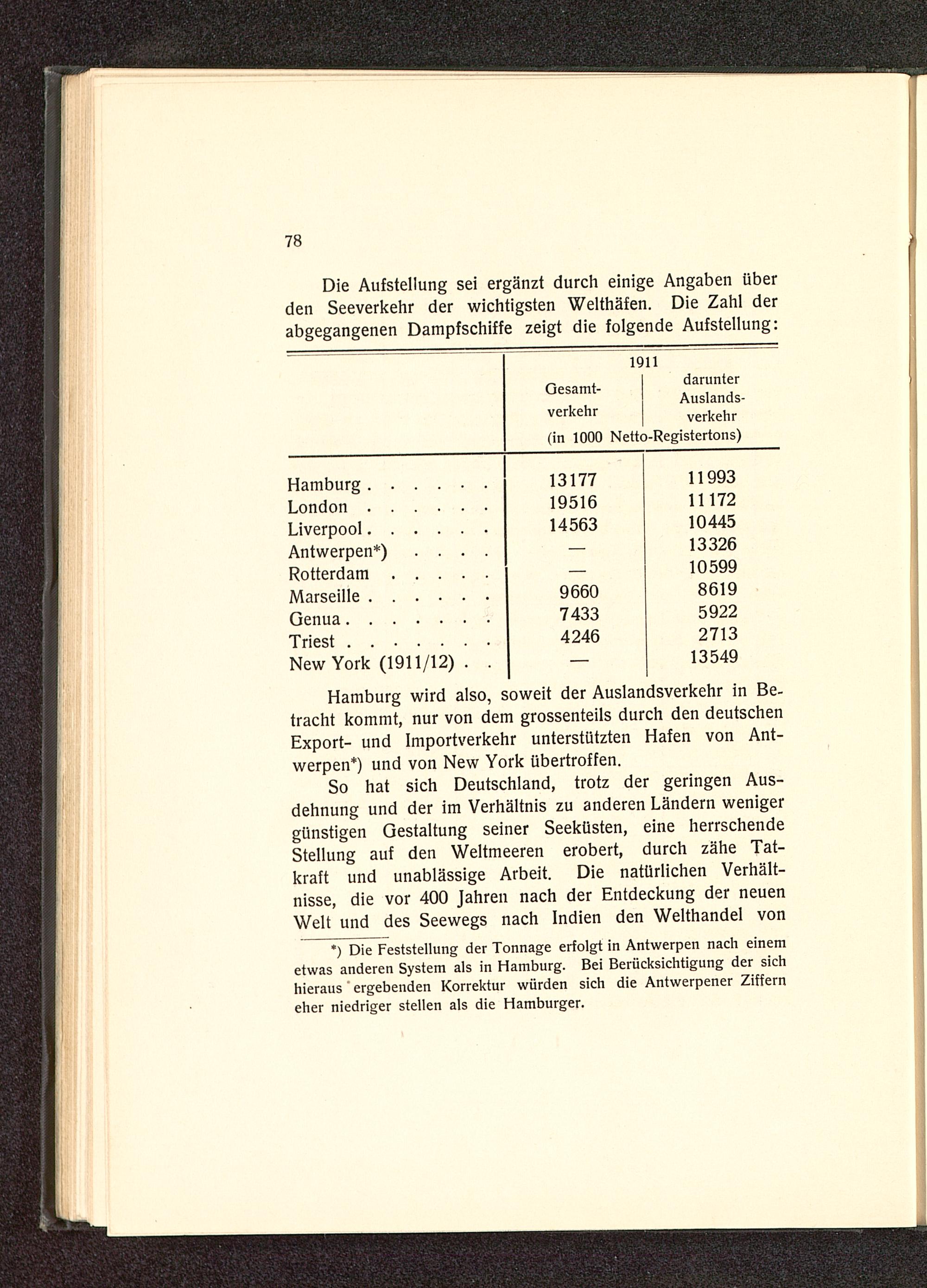 Hamburg wird also, soweit der Auslandsverkehr in Be-tracht kommt, nur von dem grossenteils durch den deutschenExport- und Importverkehr unterstützten Hafen von Ant-werpen*) und von New York übertroffen.