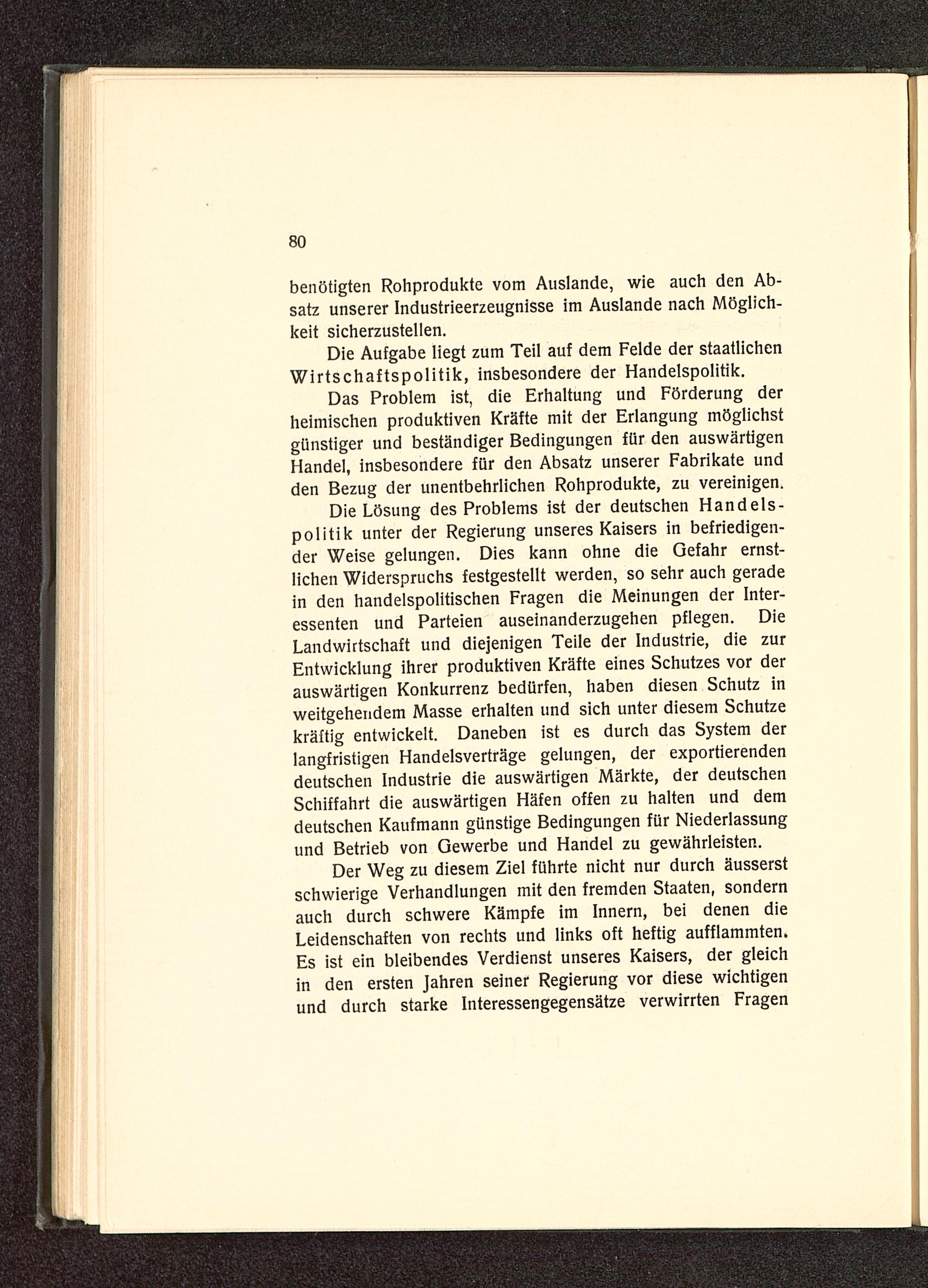 Das Problem ist, die Erhaltung und Förderung derheimischen produktiven Kräfte mit der Erlangung möglichstgünstiger und beständiger Bedingungen für den auswärtigenHandel, insbesondere für den Absatz unserer Fabrikate undden Bezug der unentbehrlichen Rohprodukte, zu vereinigen.