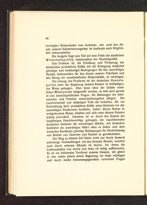 Die Lösung des Problems ist der deutschen Handels-politik unter der Regierung unseres Kaisers in befriedigen-der Weise gelungen. Dies kann ohne die Gefahr ernst-lichen Widerspruchs festgestellt werden, so sehr auch geradein den handelspolitischen Fragen die Meinungen der Inter-essenten und Parteien auseinanderzugehen pflegen. DieLandwirtschaft und diejenigen Teile der Industrie, die zurEntwicklung ihrer produktiven Kräfte eines Schutzes vor derauswärtigen Konkurrenz bedürfen, haben diesen Schutz inweitgehendem Masse erhalten und sich unter diesem Schutzekräftig entwickelt. Daneben ist es durch das System derlangfristigen Handelsverträge gelungen, der exportierendendeutschen Industrie die auswärtigen Märkte, der deutschenSchiffahrt die auswärtigen Häfen offen zu halten und demdeutschen Kaufmann günstige Bedingungen für Niederlassungund Betrieb von Gewerbe und Handel zu gewährleisten.