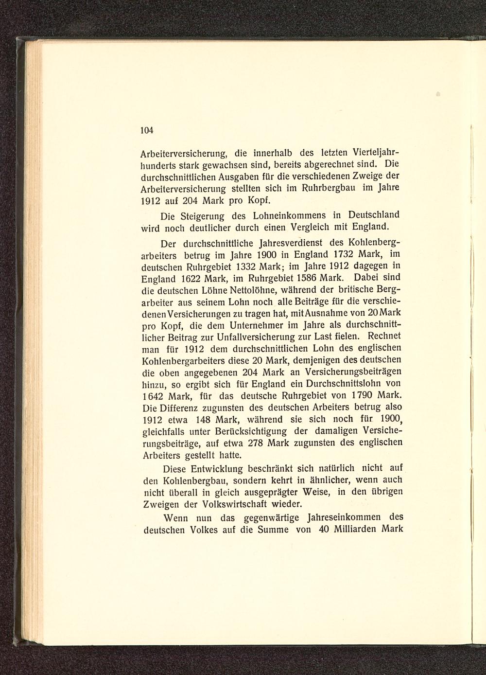 Der durchschnittliche Jahresverdienst des Kohlenberg-arbeiters betrug im Jahre 1900 in England 1732 Mark, imdeutschen Ruhrgebiet 1332 Mark; im Jahre 1912 dagegen inEngland 1622 Mark, im Ruhrgebiet 1586 Mark. Dabei sinddie deutschen Löhne Nettolöhne, während der britische Berg-arbeiter aus seinem Lohn noch alle Beiträge für die verschie-denen Versicherungen zu tragen hat, mit Ausnahme von 20 Markpro Kopf, die dem Unternehmer im Jahre als durchschnitt-licher Beitrag zur Unfallversicherung zur Last fielen. Rechnetman für 1912 dem durchschnittlichen Lohn des englischenKohlenbergarbeiters diese 20 Mark, demjenigen des deutschendie oben angegebenen 204 Mark an Versicherungsbeiträgenhinzu, so ergibt sich für England ein Durchschnittslohn von1642 Mark, für das deutsche Ruhrgebiet von 1790 Mark.Die Differenz zugunsten des deutschen Arbeiters betrug also1912 etwa 148 Mark, während sie sich noch für 1900,gleichfalls unter Berücksichtigung der damaligen Versiche-rungsbeiträge, auf etwa 278 Mark zugunsten des englischenArbeiters gestellt hatte.