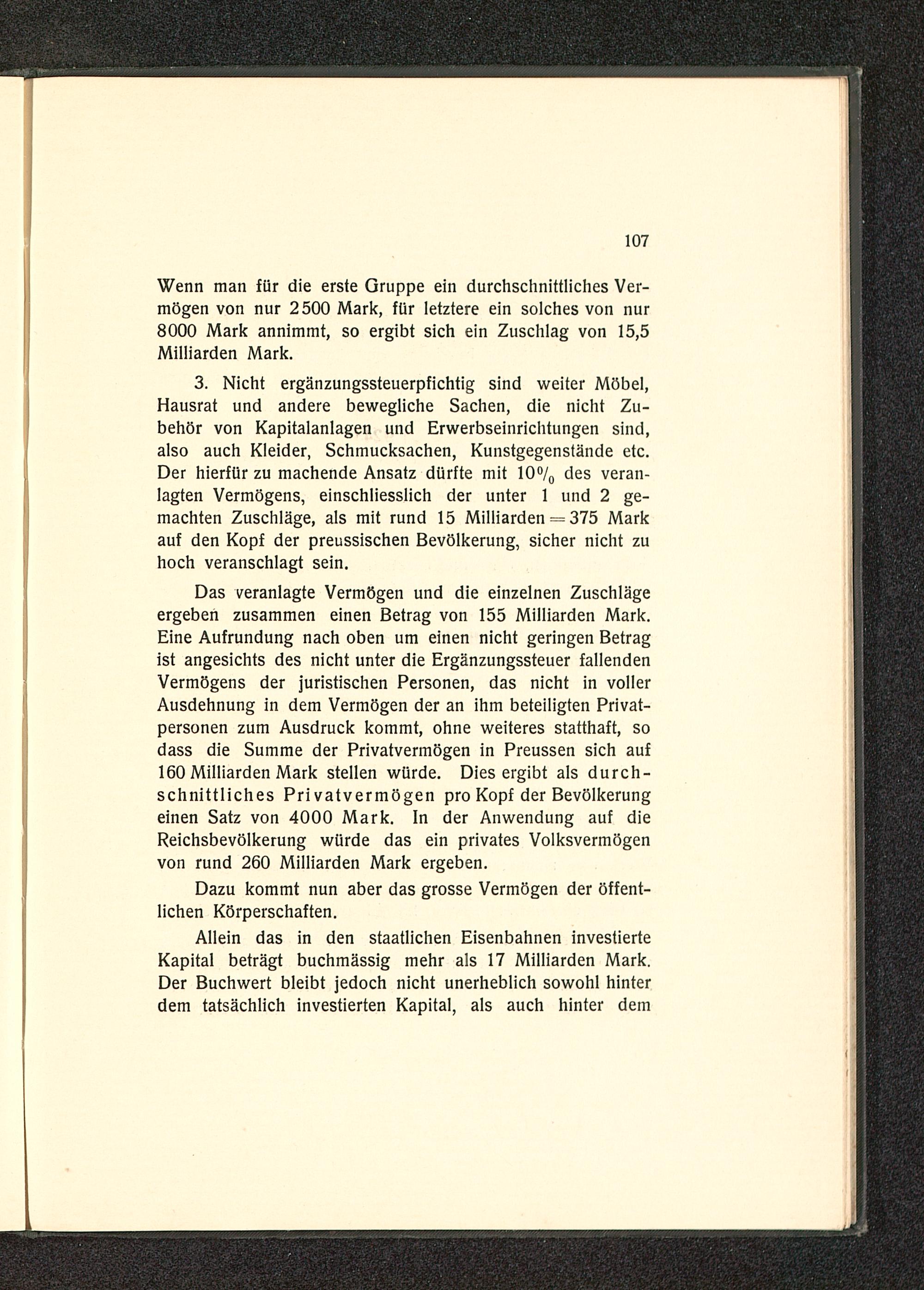 Das veranlagte Vermögen und die einzelnen Zuschlägeergeben zusammen einen Betrag von 155 Milliarden Mark.Eine Aufrundung nach oben um einen nicht geringen Betragist angesichts des nicht unter die Ergänzungssteuer fallendenVermögens der juristischen Personen, das nicht in vollerAusdehnung in dem Vermögen der an ihm beteiligten Privat-personen zum Ausdruck kommt, ohne weiteres statthaft, sodass die Summe der Privatvermögen in Preussen sich auf160 Milliarden Mark stellen würde. Dies ergibt als durch-schnittliches Privatvermögen pro Kopf der Bevölkerungeinen Satz von 4000 Mark. In der Anwendung auf dieReichsbevölkerung würde das ein privates Volksvermögenvon rund 260 Milliarden Mark ergeben.