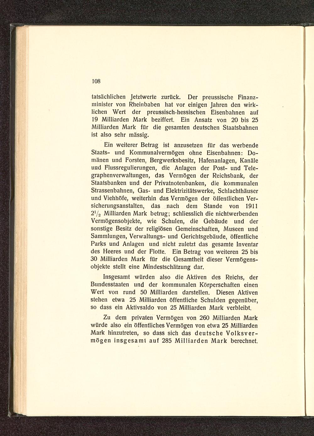Zu dem privaten Vermögen von 260 Milliarden Markwürde also ein öffentliches Vermögen von etwa 25 MilliardenMark hinzutreten, so dass sich das deutsche Volksver-mögen insgesamt auf 285 Milliarden Mark berechnet.