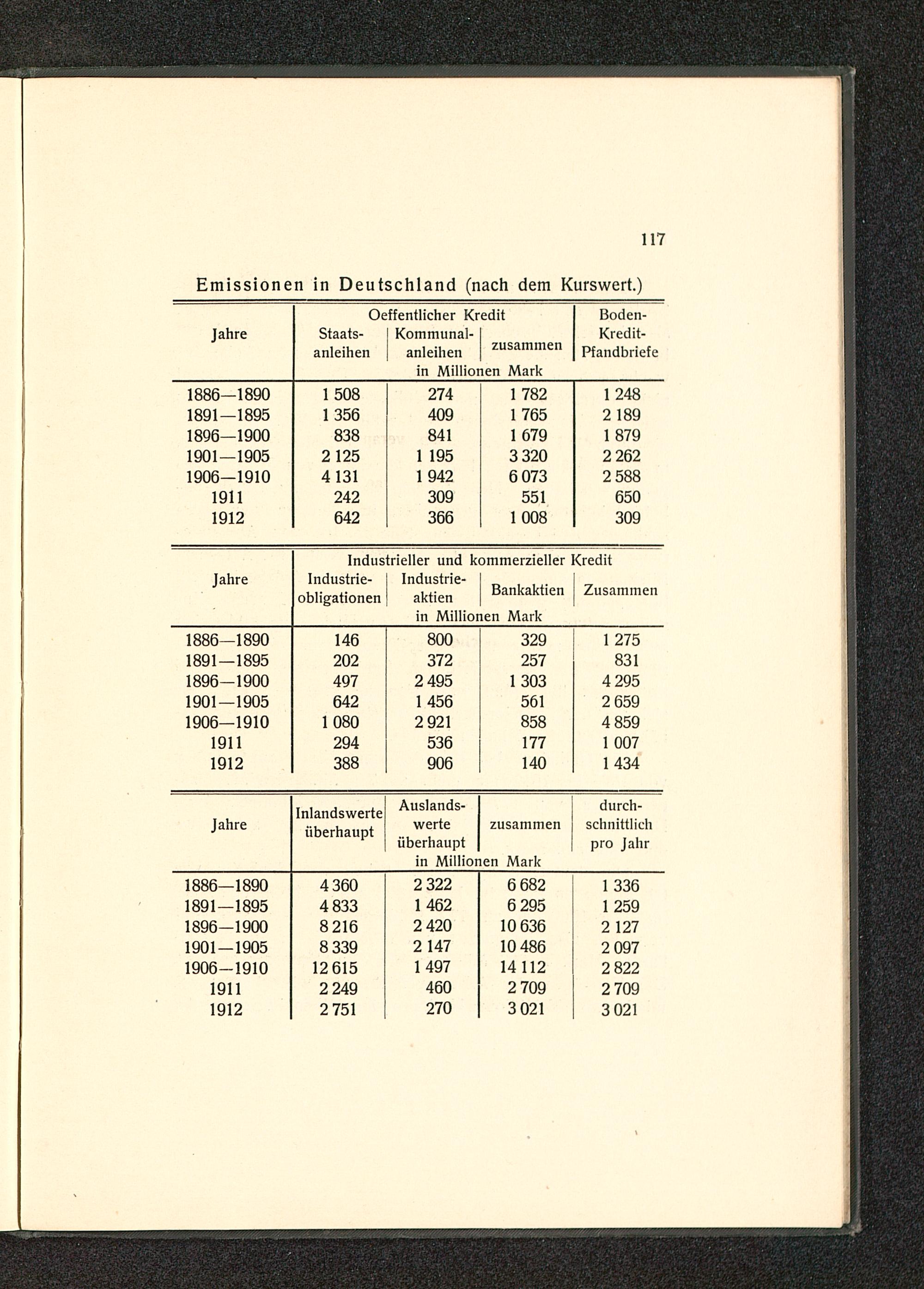Oeffentlicher Kredit Boden-Jahre Staats- Kommunal- Kredit-anleihen anleihen zusammen Pfandbriefein Millionen Mark1886 — 1890 1508 274 1782 12481891 — 1895 1 356 409 1 765 21891896 — 1900 838 841 1 679 18791901 — 1905 2125 1195 3 320 2 2621906 —1910 4131 1942.073 2 5881911 242 309 551 6501912 642 366.008 309Industrieller und kommerzieller KreditJahre Industrie- Industrie- Bankaktien Zusammenobligationen aktienin Millionen Mark1886 — 1890 146 800 329 12751891 — 1895 202 372 257 8311896 — 1900 497 2495 1 303 42951901 — 1905 642 1 456 561 26591906 —1910 1080 2921 858 48591911 294 536 177 10071912 388 906 140 1 434Jahre InlandswerteAuslands- zusammen durchschnittlichüberhaupt überhaupt pro Jahrin Millionen Mark1886 — 1890360 2 322 6682 1 3361891 — 1895 4833 1 462 6 295 12591896 — 1900 8216 2420 10 636 21271901— 1905 8339 2147 10 486.0971906 —1910 12 615 1497 14 112 28221911 2249 460 2709 27091912 2751 270 3021 3021