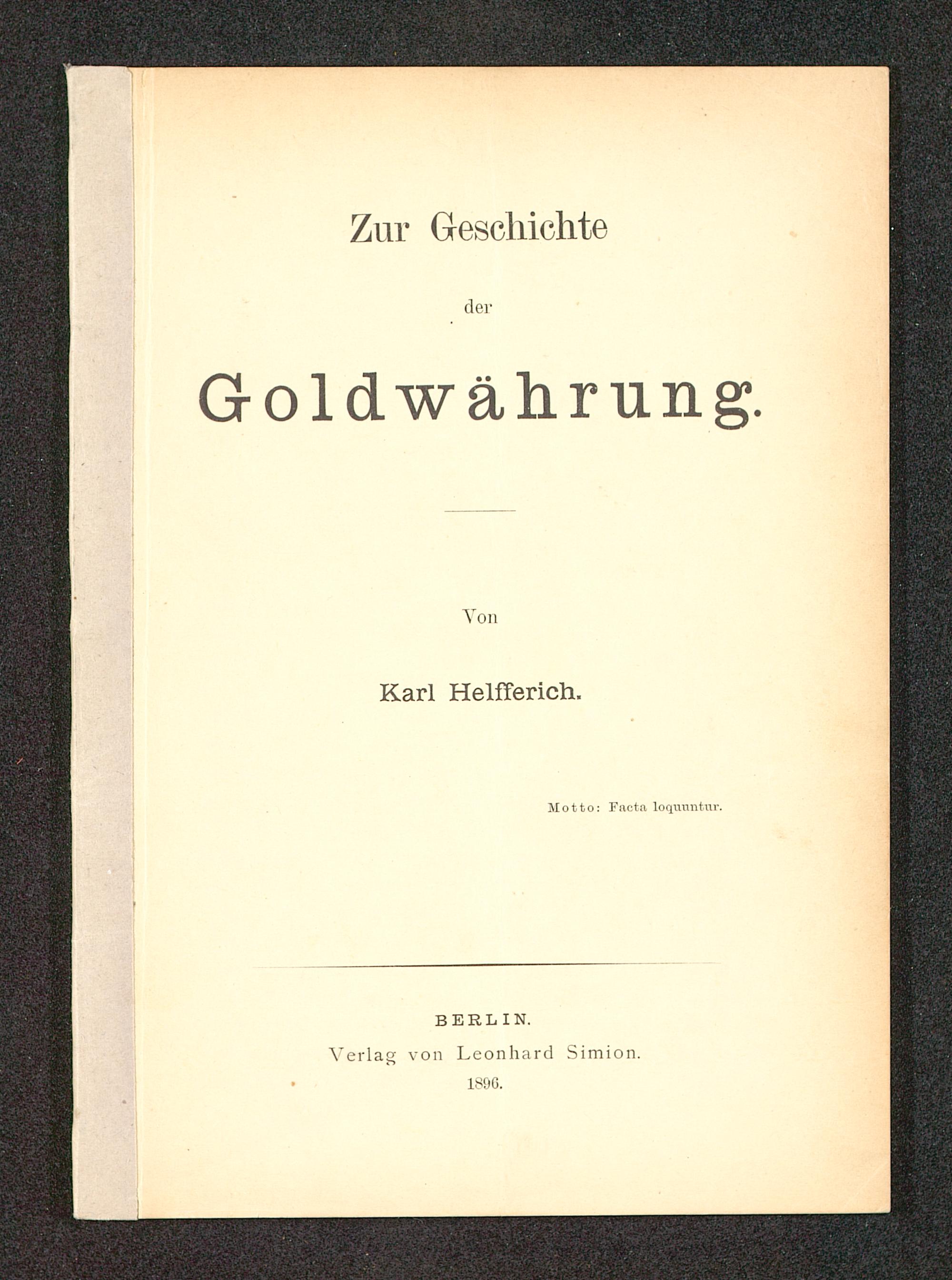 Zur Geschichtederldwährung.TonKarl Helfferich .Motto: Fncta loqmintnv.BERLIN .Verlag von Leonhard Simion.189G.