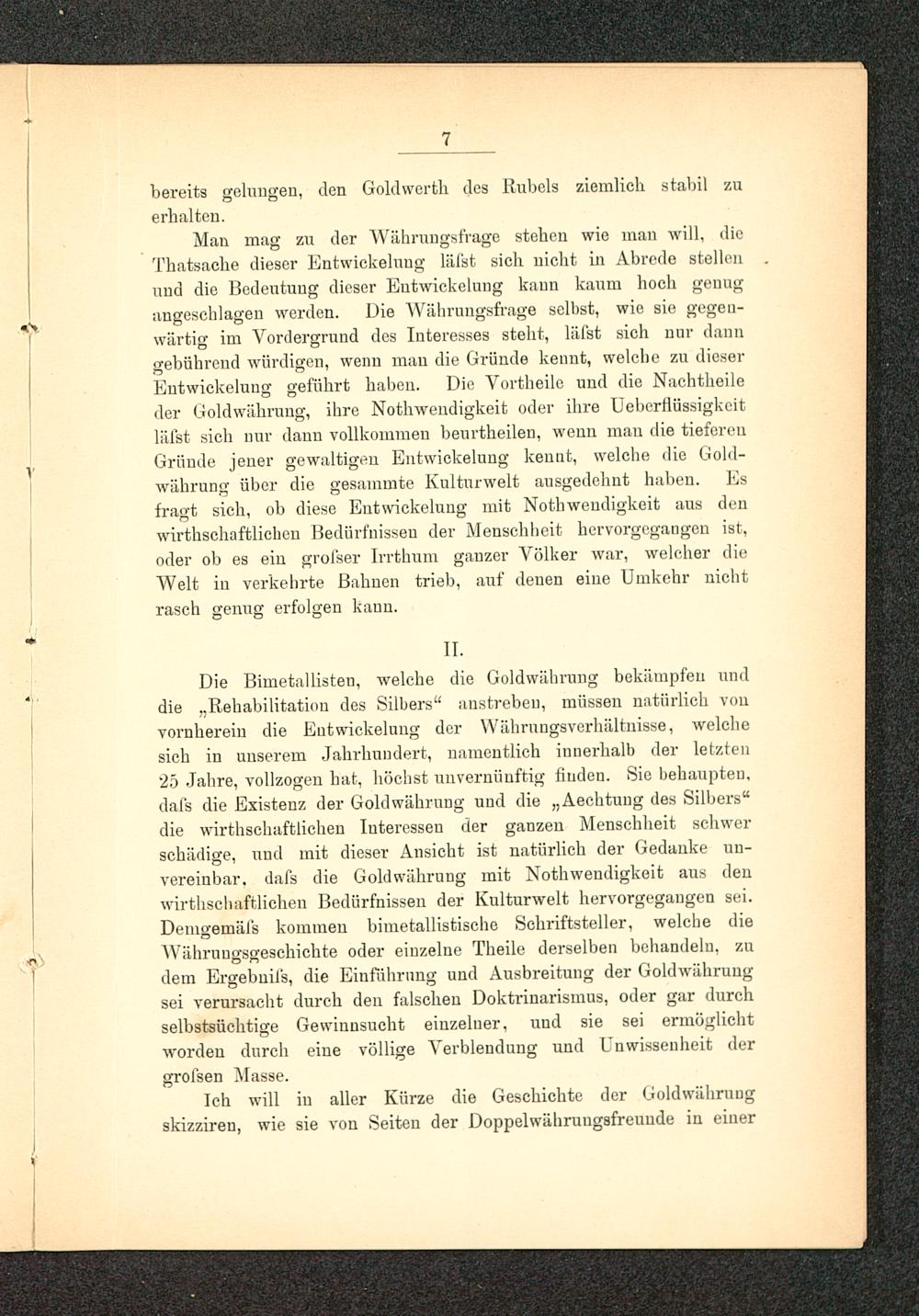 Man mag zu der Währungsfrage stehen wie mau will, dieThatsache dieser Entwickelung läfst sich nicht in Abrede stellenund die Bedeutung dieser Entwickelung kann kaum hoch genugangeschlagen werden. Die Währungsfrage selbst, wie sie gegen-wärtig im Vordergrund des Interesses steht, läfst sich nur danngebührend würdigen, wenn mau die Gründe kennt, welche zu dieserEntwickelung geführt haben. Die Vortheile und die Nachtheileder Goldwährung, ihre Nothwendigkeit oder ihre Ueberflüssigkcitläfst sich nur dann vollkommen beurtheilen, wenn mau die tiefereuGründe jener gewaltigen Entwickelung kennt, welche die Gold-währung über die gesammte Kulturwelt ausgedehnt haben. Esfragt sich, ob diese Entwickelung mit Nothwendigkeit aus denwirtschaftlichen Bedürfnissen der Menschheit hervorgegangen ist,oder ob es ein grofser Irrthum ganzer Völker war, welcher dieWelt iu verkehrte Bahnen trieb, auf denen eine Umkehr nichtrasch genug erfolgen kann.