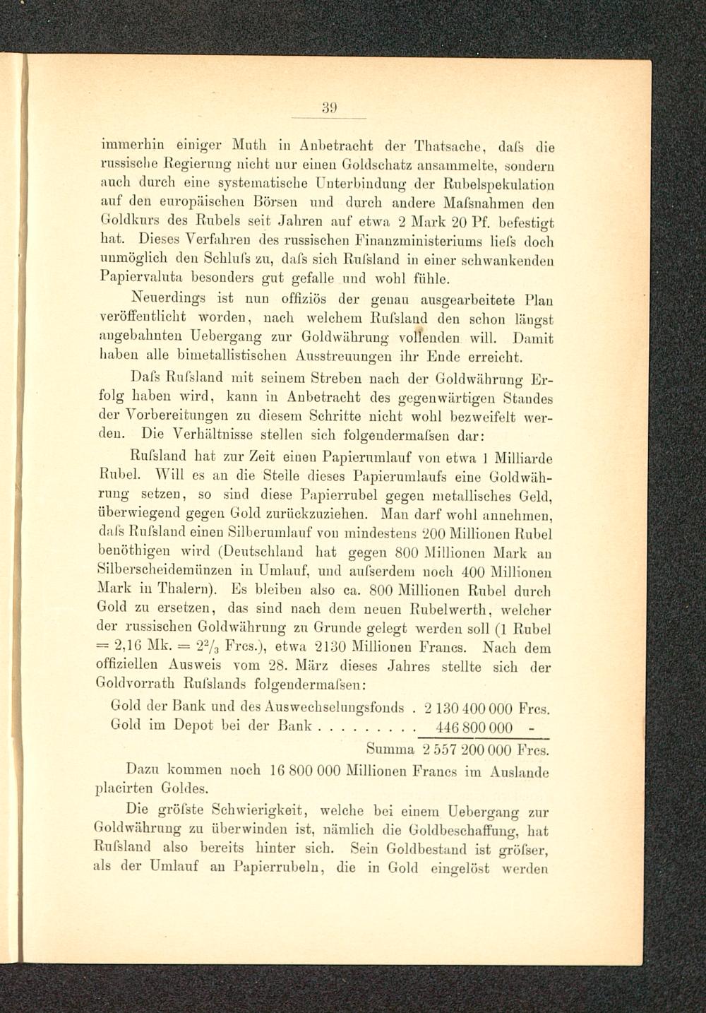 Rufsland hat zur Zeit einen Papierumlauf von etwa 1 MilliardeRubel. Will es au die Steile dieses Papierumlaufs eine Goldwäh-rung setzen, so sind diese Papierrubel gegen metallisches Geld,überwiegend gegen Gold zurückzuziehen. Man darf wohl annehmen,dafs Rufslaud einen Silberumlauf von mindestens 200 Millionen Rubelbeuöthigen wird (Deutschland hat gegen 800 Millionen Mark anSilberscheidemünzen in Umlauf, und aul'serdeni noch 400 MillionenMark in Thalern ). Es bleiben also ca. 800 Millionen Rubel durchGold zu ersetzen, das sind nach dem neuen Rubelwerth, welcherder russischen Goldwährung zu Grunde gelegt werden soll (1 Rubel= 2,10 Mk. = 2 2 / 3 Frcs.), etwa 2130 Millionen Francs. Nach demoffiziellen Ausweis vom 28. März dieses Jahres stellte sich derGoldvorrath Rul'slands folgendermal'sen:
