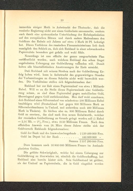 Die gröfste Schwierigkeit, welche bei einem Uebergang zurGoldwährung zu überwinden ist, nämlich die Geldbeschaffung, hatRufsland also bereits hinter sich. Sein Goldbestand ist gröfser,als der Umlauf au Papierrubelu, die in Gold eingelöst werden