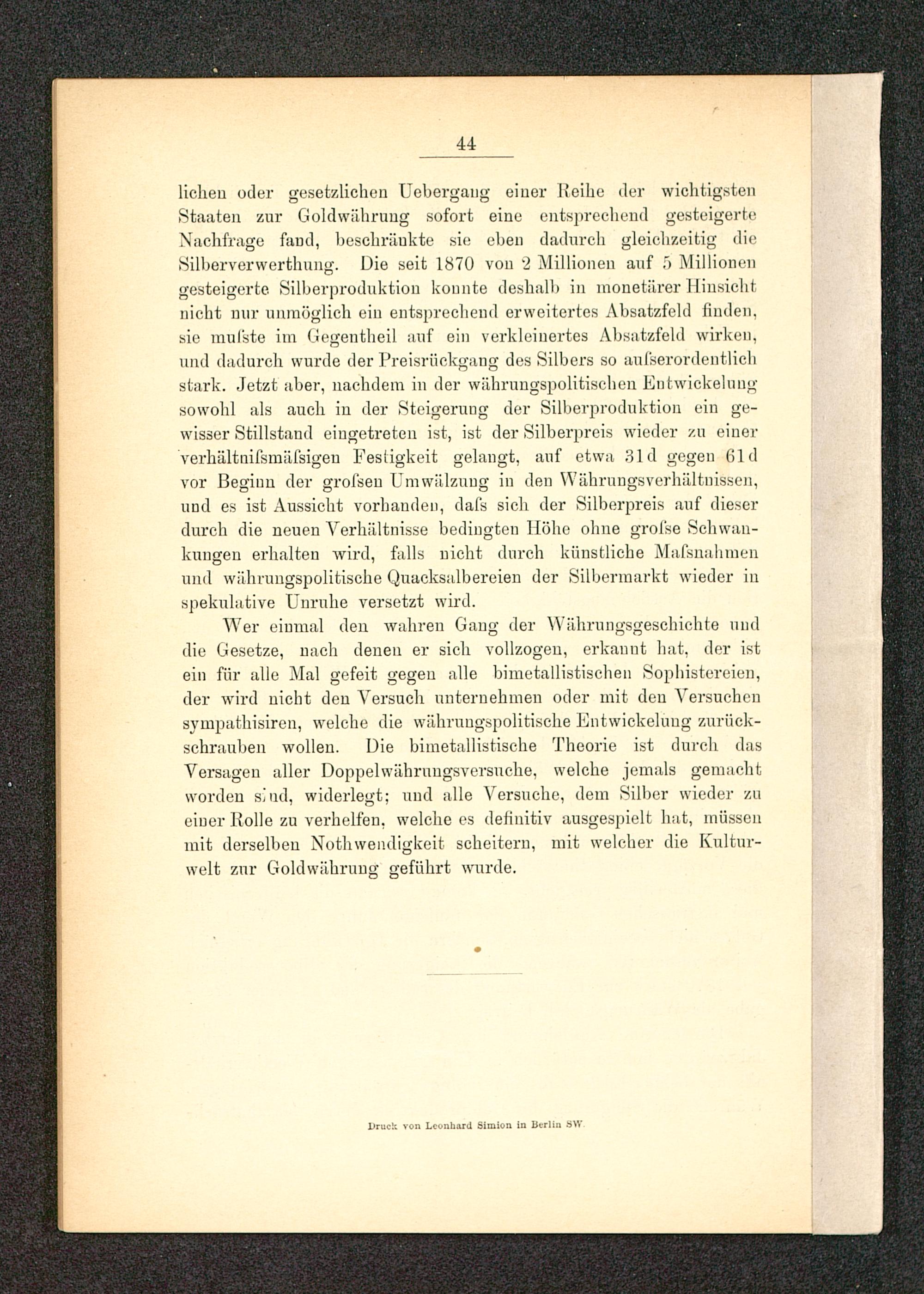 Wer einmal den wahren Gang der Währungsgeschichte unddie Gesetze, nach denen er sich vollzogen, erkannt hat, der istein für alle Mal gefeit gegen alle bimetallistischen Sophistereien,der wird nicht den Versuch unternehmen oder mit den A T ersuchensympathisiren, welche die währuugspolitische Entwickelüng zurück-schrauben wollen. Die biinetallistische Theorie ist durch dasVersagen aller Doppelwähruugsversuche, welche jemals gemachtworden Bind, widerlegt; und alle Versuche, dem Silber wieder zueiner Rolle zu verhelfen, welche es definitiv ausgespielt hat, müssenmit derselben Notwendigkeit scheitern, mit welcher die Kultur-welt zur Goldwährung geführt wurde.