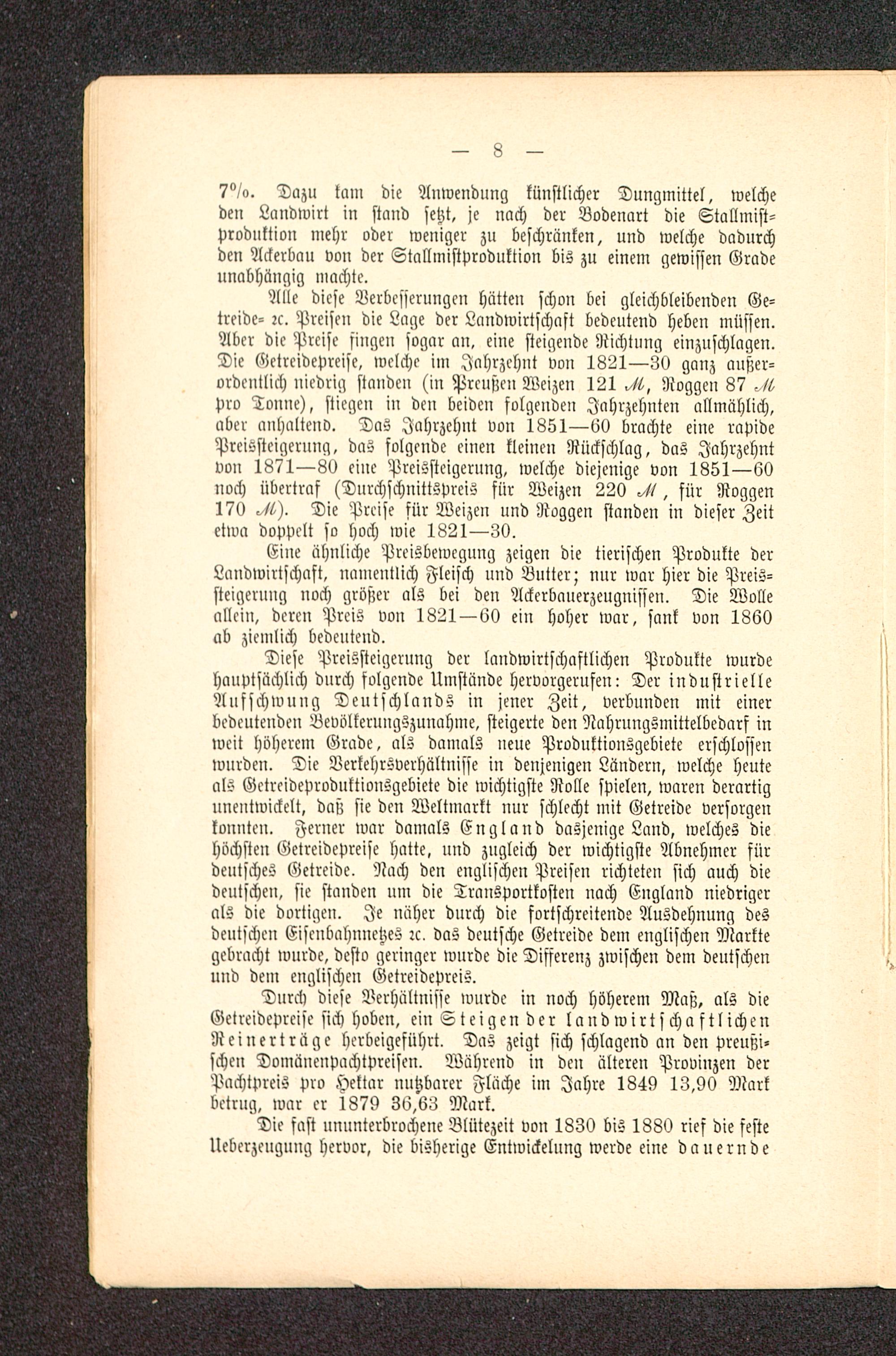 Alle diese Verbesserungen hätten schon bei gleichbleibenden Ge-treide- zc. Preisen die Lage der Landwirtschaft bedeutend heben müssen.Aber die Preise fingen sogar an, eine steigende Richtung einzuschlagen.Die Gctreidepreise, welche im Jahrzehnt von 1821—30 ganz außer-ordentlich niedrig standen (in Preußen Weizen 121 Roggen 87 ^pro Tonne), stiegen in den beiden folgenden Jahrzehnten allmählich,aber anhaltend. Das Jahrzehnt von 1851—60 brachte eine rapidePreissteigerung, das folgende einen kleinen Rückschlag, das Jahrzehntvon 1871—80 eine Preissteigerung, welche diejenige von 1851—60noch übertraf (Durchschnittspreis für Weizen 220 , für Roggen170 Die Preise für Weizen und Roggen standen in dieser Zeit