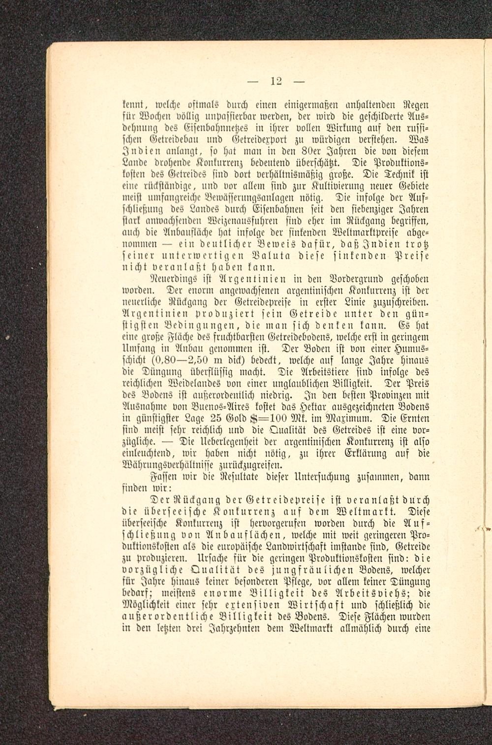 Der Rückgang der Getreidepreise ist veranlaßt durchdie überseeische Konkurrenz auf dem Weltmarkt. Dieseüberseeische Konkurrenz ist hervorgerufen worden durch die Auf-schließung von Anbauflächen, welche mit weit geringeren Pro-duktionskosten als die europäische Landwirtschaft imstande sind, Getreidezu Produzieren. Ursache für die geringen Produktionskosten sind: dievorzügliche Qualität des jungfräulichen Bodens, welcherfür Jahre hinaus keiner besonderen Pflege, vor allem keiner Düngungbedarf; meistens enorme Billigkeit des Arbeitsviehs; dieMöglichkeit einer sehr extensiven Wirtschaft und schließlich dieaußerordentliche Billigkeit des Bodens. Diese Flüchen wurdenin den letzten drei Jahrzehnten dem Weltmarkt allmählich durch eine