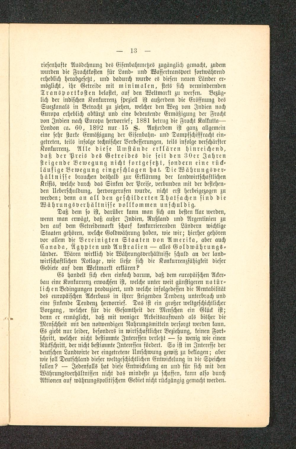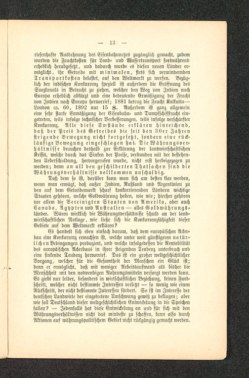 riesenhafte Ausdehnung des Eisenbahnnetzes zugänglich gemacht, zudemwurden die Frachtkosten für Land- und Wassertranspart fortwährenderheblich herabgesetzt, und dadurch wurde es diesen neuen Länder er-möglicht, ihr Getreide mit minimalen, stets sich verminderndenTransportkosten belastet, ans den Weltmarkt zu werfen. Bezüg-lich der indischen Konkurrenz speziell ist außerdem die Eröffnung desSuezkanals in Betracht zu ziehen, welcher den Weg von Indien nachEuropa erheblich abkürzt und eine bedeutende Ermäßigung der Frachtvon Indien nach Europa hervorrief; 1881 betrug die Fracht Kalkutta —London ca. 60, 1892 nnr 15 K. Außerdem ist gauz allgemeineine sehr starke Ermäßigung der Eisenbahn- und Tampfschifffracht ein-getreten, teils infolge technischer Verbesserungen, teils infolge verschärfterKonkurrenz. Alle diese Umstände erklären hinreichend,daß der Preis des Getreides die seit den 30er Jahrensteigende Bewegung nicht fortgesetzt, sondern eine rück-läufig e B e w e g u n g eingeschlagen hat. Die Währungsver-hältnisse brauchen deshalb zur Erklärung der landwirtschaftlichenKrisis, welche durch das Sinken der Preise, verbunden mit der bestehen-den Ucbcrschuldung, hervorgerufen wurde, nicht erst herbeigezogen zuwerden; denn an all den geschilde rten Thatsa chen sind dieWährungsverhältnisse vollkommen unschuldig.