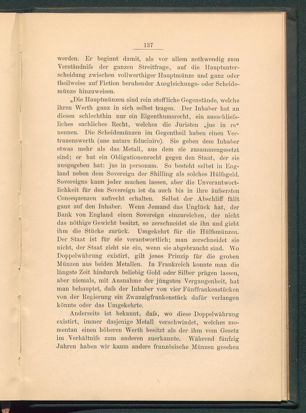 „Die Hauptmünzen sind rein stoffliche Gegenstände, welcheihren Werth ganz in sich selbst tragen. Der Inhaber hat andiesen schlechthin nur ein Eigen thumsrecht, ein ausschliel's-liches sachliches Recht, welches die Juristen „jus in re anennen. Die Scheidemünzen im Gegentheil haben einen Ver-trauenswerth (une nature fiduciaire). Sie geben dem Inhaberetwas mehr als das Metall, aus dem sie zusammengesetztsind; er hat ein Obligationenrecht gegen den Staat, der sieausgegeben hat: jus in personam. So besteht selbst in Eng-land neben dem Sovereign der Shilling als solches Hiilfsgeld.Sovereigns kann jeder machen lassen, aber die Unverantwort-lichkeit für den Sovereign ist da auch bis in ihre äul'serstenConsequenzen aufrecht erhalten. Selbst der Abschliff fälltganz auf den Inhaber. Wenn Jemand das Unglück hat, derBank von England einen Sovereign einzureichen, der nichtdas nöthige Gewicht besitzt, so zerschneidet sie ihn und giebtihm die Stücke zurück. Umgekehrt für die Hülfsmünzen.Der Staat ist für sie verantwortlich; man zerschneidet sienicht, der Staat zieht sie ein, wenn sie abgebraucht sind. WoDoppelwährung existirt, gilt jenes Prinzip für die grobenMünzen aus beiden Metallen. In Frankreich konnte man dielängste Zeit hindurch beliebig Gold oder Silber prägen lassen,aber niemals, mit Ausnahme der jüngsten Vergangenheit, hatman behauptet, dafs der Inhaber von vier Fünffrankenstückenvon der Regierung ein Zwanzigfrankenstück dafür verlangenkönnte oder das Umgekehrte.
