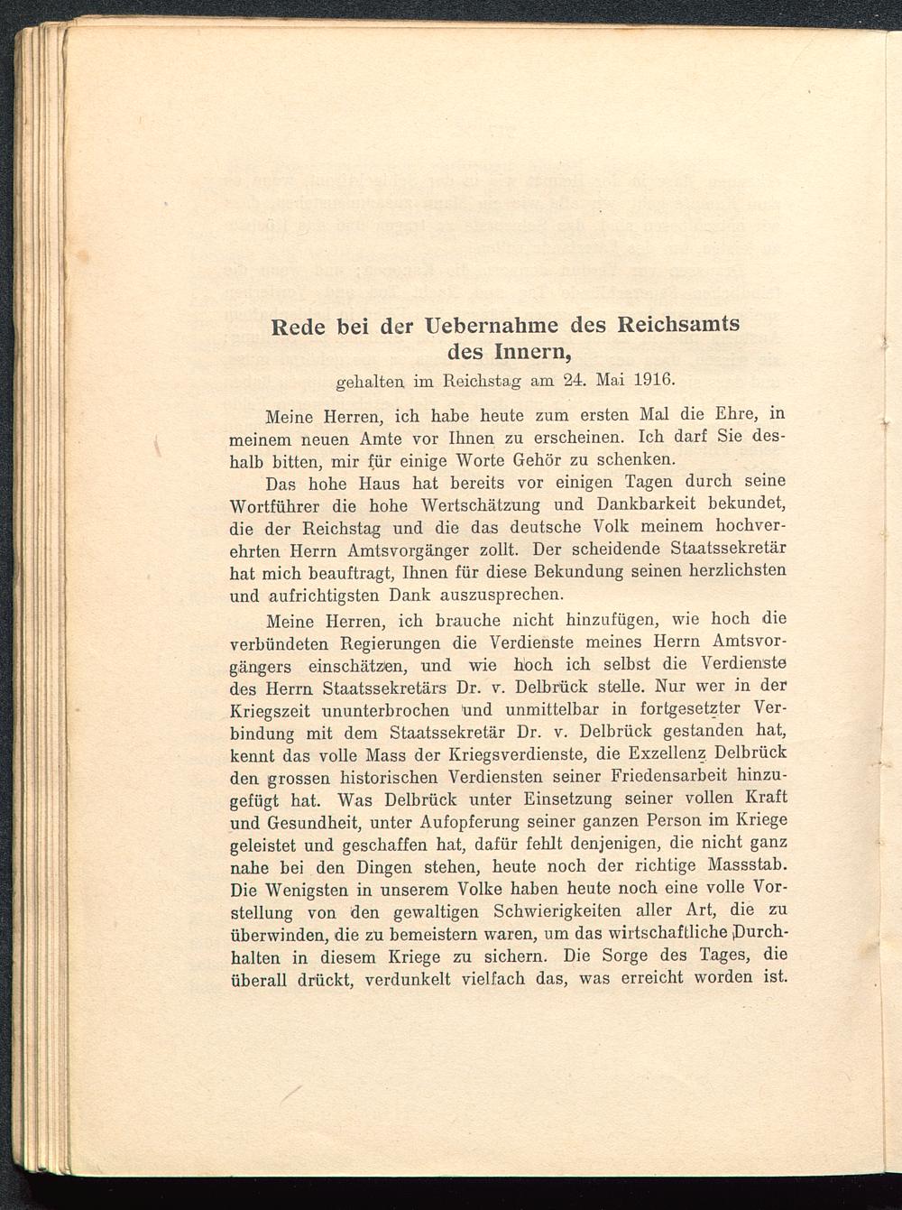 Rede bei der Uebernahme des Reichsamts des Innern, gehalten im Reichstag am 24. Mai 1916