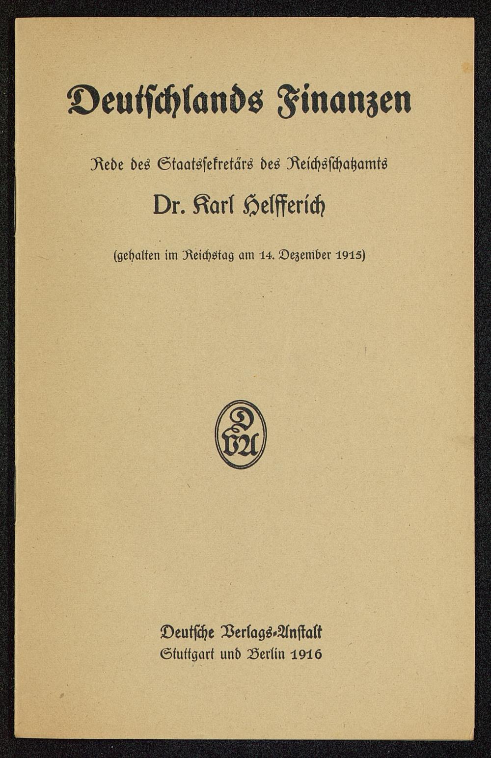 Deutschlands Finanzen : Rede d. Staatssekretärs d. Reichsschatzamts Dr. Karl Helfferich <geh. im Reichstag am 14. Dez. 1915>